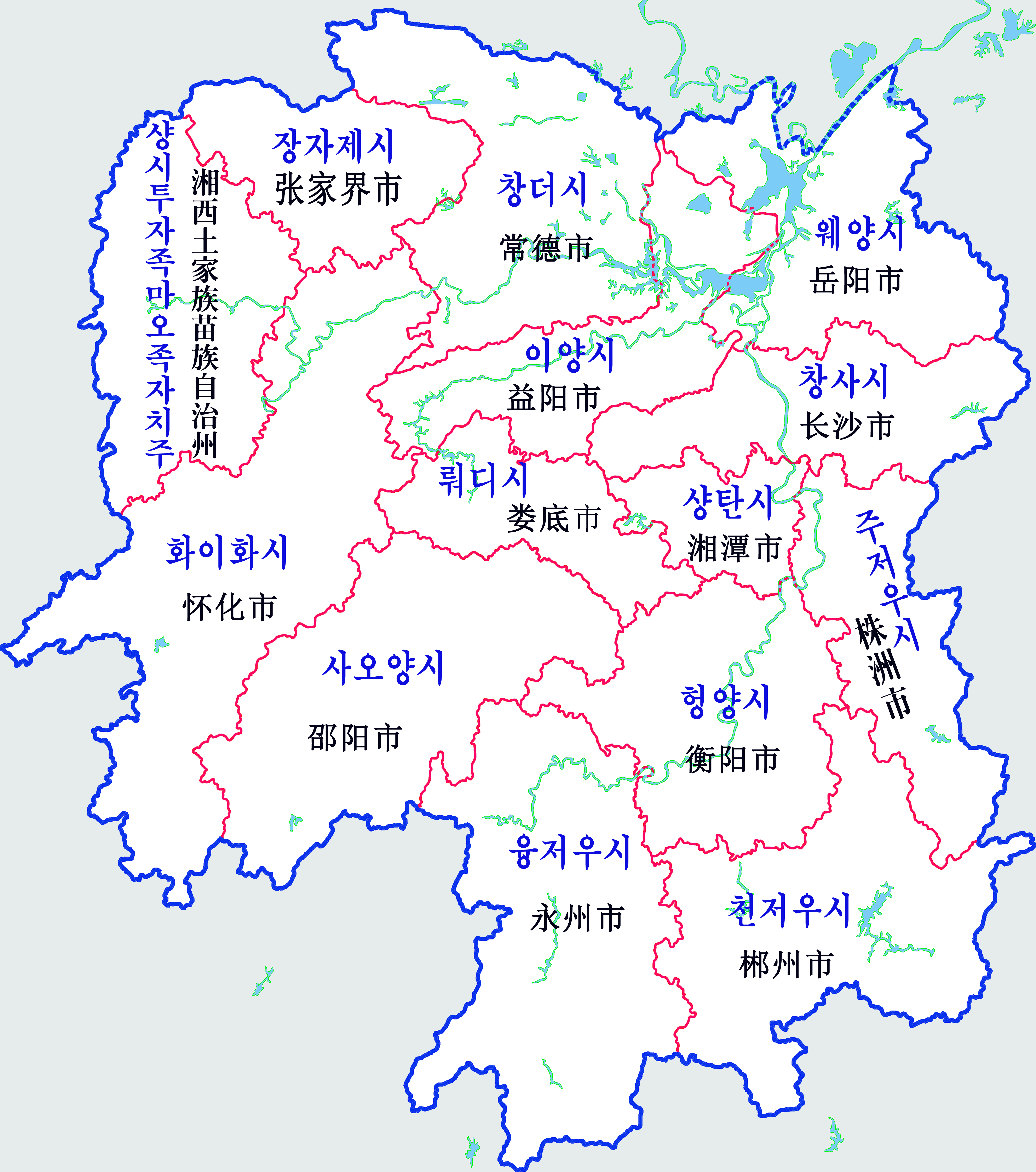 후난성은 13개 지급시와 1개 자치주로 구성되어 있다.후난 성의 행정구역 | ||||||