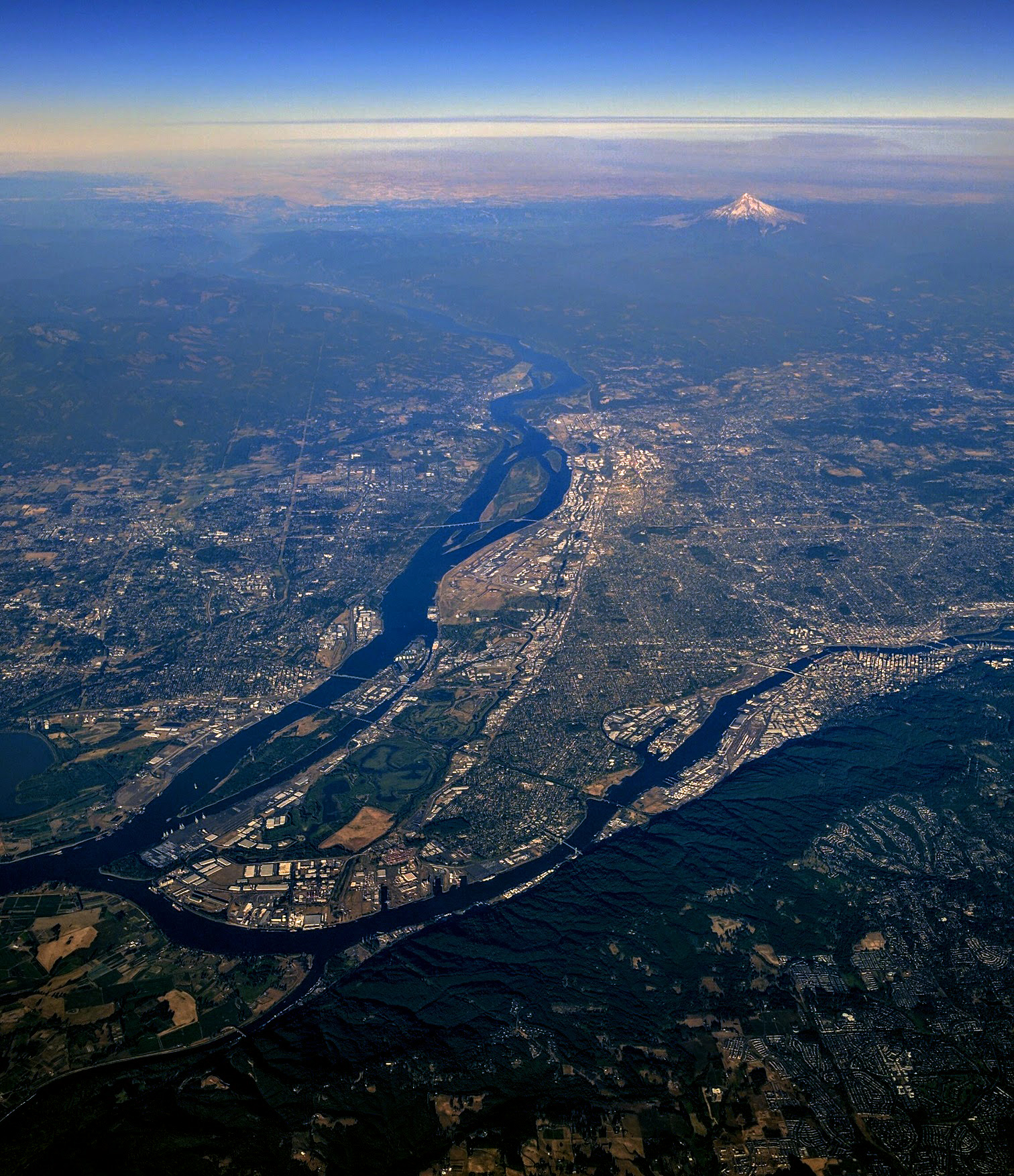 후드산을 배경으로 포틀랜드-밴쿠버 대도시 지역의 항공 사진