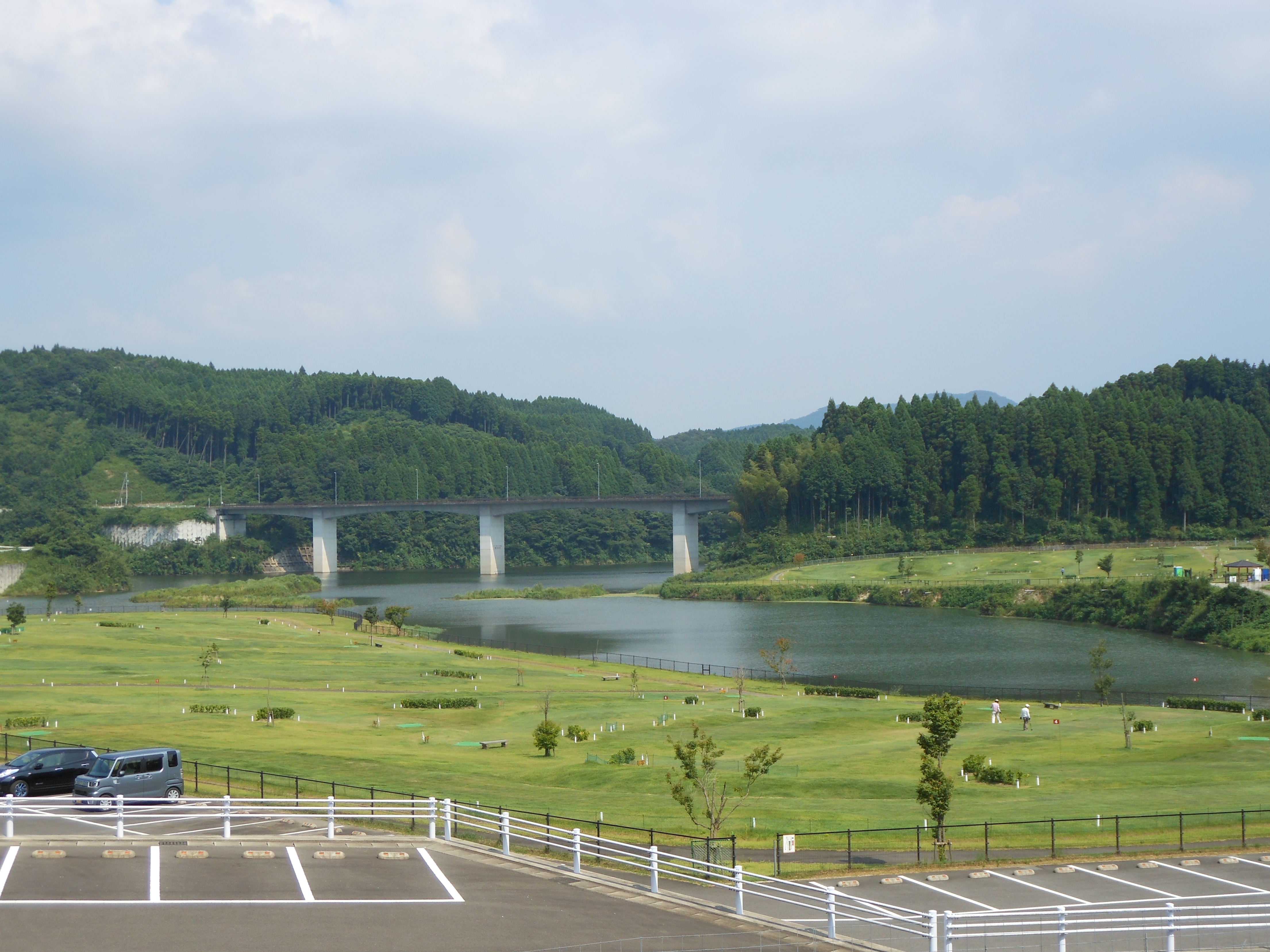 신미즈카와 파크 골프장(오쿠시). 뒤쪽은 후지 샤쿠나게 호와 신미즈카와 대교