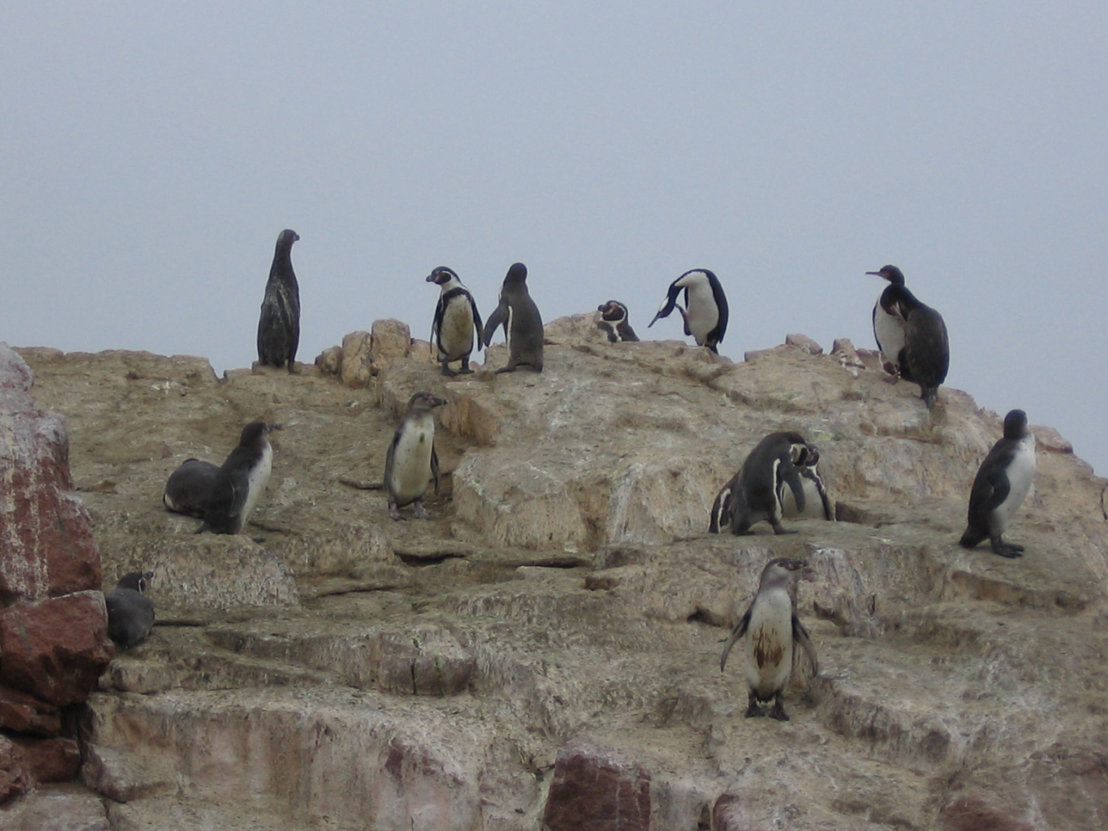 - 구아노 채취: 역사적으로 페루와 칠레 북부 해안 섬의 두꺼운 구아노 층은 훔볼트펭귄의 주요 번식지였으나, 비료 자원으로 각광받으면서 대규모 채취가 이루어져 번식지가 심각하게 파괴되었다.[30][44][32] 1800년대 개체 수 감소의 주요 원인으로 지목된다.[34][32]