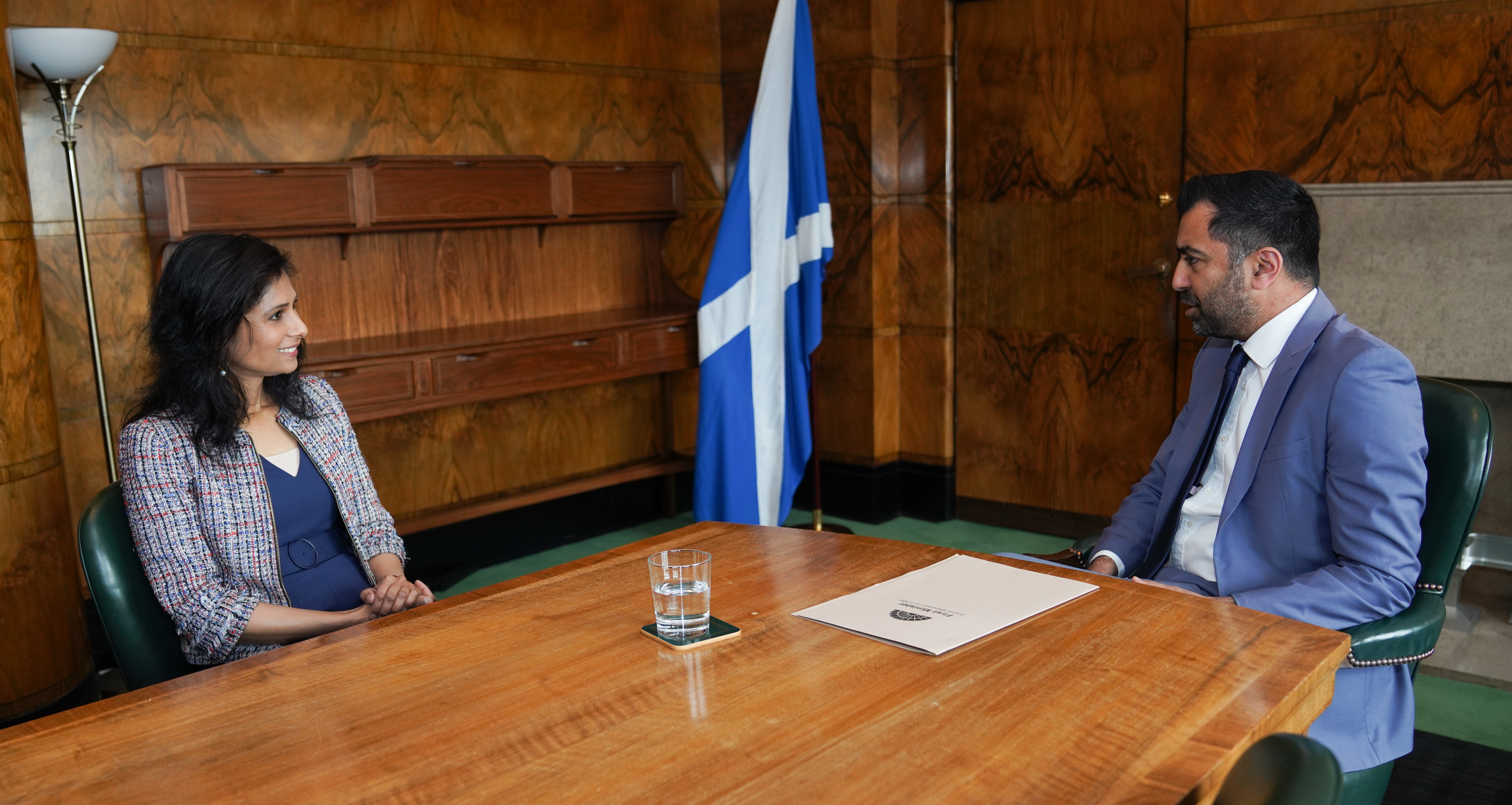 2023년 3월, 스코틀랜드 국민당 대표이자 스코틀랜드 자치 정부 수반이 되었으며, 영국 지방 자치 정부 최초의 소수 민족 지도자이자, 영국의 주요 정당을 이끄는 최초의 이슬람교도가 되었다.[161] 2024년 4월 말, 스코틀랜드 녹색당과의 연립 협정을 파기하면서 녹색당과의 대립이 결정적이 되었고, 4월 29일 자치 정부 수상직 사임을 표명했다.[162]