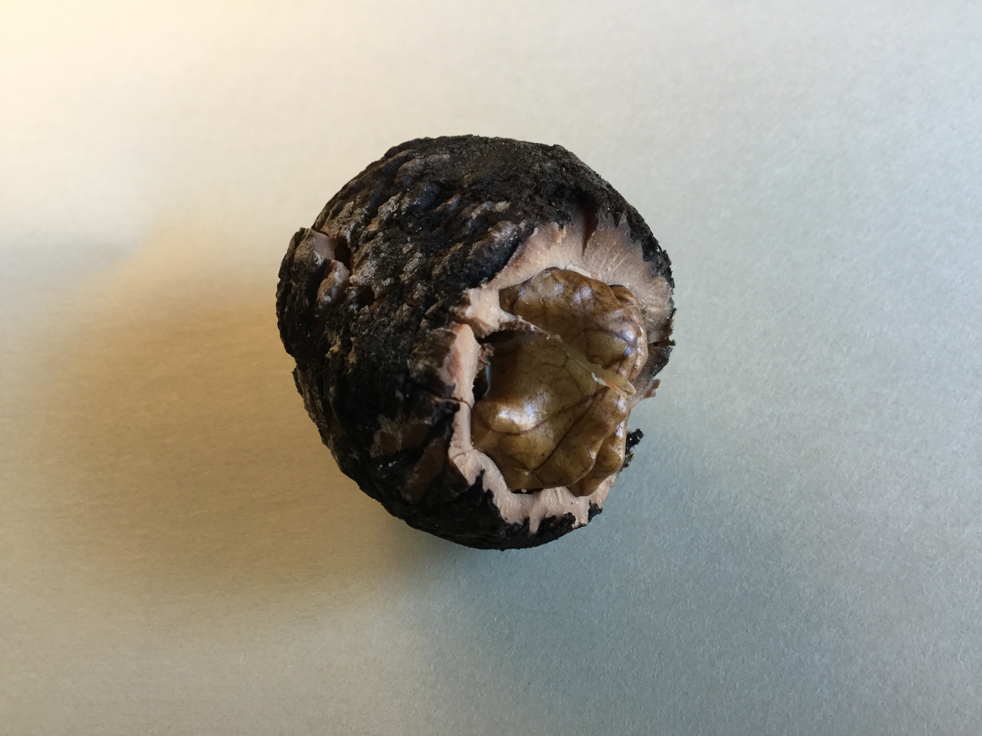- '''열매:''' 여름/가을에 갈색 녹색 반육질의 껍질과 갈색의 물결 모양의 견과를 가진 구형 열매(견과)로 익는다. 껍질을 포함한 전체 열매는 10월에 떨어진다. 씨앗은 비교적 작고 매우 단단하다.