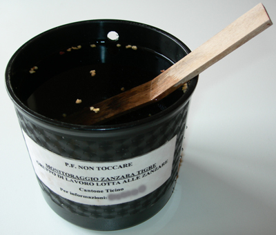 흰줄숲모기의 존재와 통제 프로그램의 결과를 감시하기 위해 모기 산란덫()이 사용된다. 모기 산란덫은 물 표면에 닿아 있는 스티로폼 블록이나 나무 노가 있는 폐수 용기로, 암컷 흰줄숲모기가 물 표면에 알을 낳는 습성을 이용한다. 실험실에서 이 알들에서 부화하는 알들이나 유충을 식별하여 모기 종의 존재와 그 수를 추정할 수 있다.[130][131] 모기가 저장한 알들을 부화시키는 점착막이 있는 덫(끈끈이 덫)은 분석을 더 쉽고 빠르게 하지만 취급이 더 복잡하다.[130][131] 모기 산란덫의 결과는 가변적이고, 알을 낳을 수 있는 다른 물의 이용 가능성에 영향을 받는다. 따라서 많은 수의 덫을 사용하고 다른 방법과 함께 이용하는 것이 가장 좋다.7. 4. 기타 방제 방법