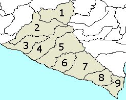 히다카 진흥국은 6개의 군과 7개의 정으로 구성된다.