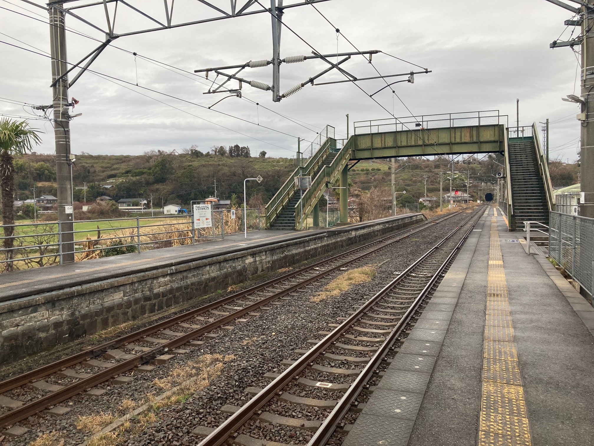 이 역은 선로 2개와 상대식 승강장 2개로 구성되어 있다. 1번 선로는 통과선, 2번 선로는 대피선이며, 1번 선로에서 측선이 분기된다. 역 건물은 기와 지붕을 얹은 목조 일본식으로 지어졌으며, 역무원이 없어 대기실 역할만 한다. 반대편 승강장으로는 보행자 통로를 이용하여 접근한다.[2][3]상대식 승강장 2면 2선을 갖춘 지상역이다. 목조역사가 있으며, 승강장끼리는 육교로 연결되어 있다. 2022년 9월 22일까지 운행했던 817계 전동차에 맞춰 2량 분의 승강장이 높아졌다. 하행선은 직선이지만, 근처 역과는 달리 1선 스루 구조가 아니어서 모든 열차가 좌측 통행을 하고 있으며, 과거에는 상행 특급 열차도 60km/h의 속도 제한을 받으며 통과했다.