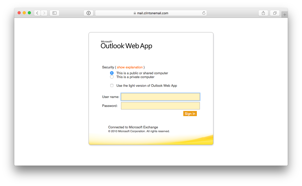 서버는 마이크로소프트 익스체인지 서버를 실행하며,[33][34] 인터넷을 통한 이메일 접근은 아웃룩 웹 앱을 통해 제공되었다. 웹 페이지는 TLS 인증서로 보호되지만, 사용 초기 두 달 동안 (2009년 1월~3월)은 TLS 인증서로 보호되지 않아 정보가 암호화되지 않았고 가로채기에 취약했을 수 있다.[24]