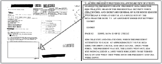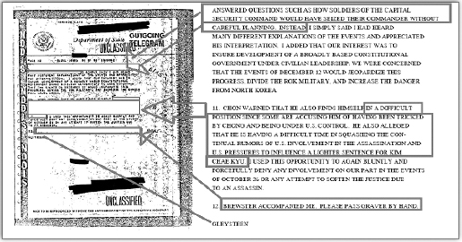 정권을 장악한 전두환이 미국 측과 모종의 묵계를 체결했다는 의혹도 있다. 1993년 말 미국이 공개했다가 삭제한 비밀 문서 전문 11항에는 전두환이 미국을 경고하고, 미국이 박정희 시해 사건에 연관되어 있다는 소문을 진정시키기 위해 노력하고 있다는 내용이 담겨 있다.[138]