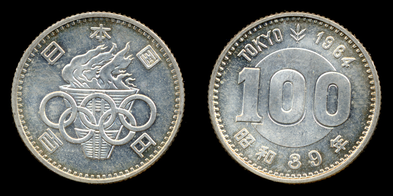 1964년에는 도쿄 올림픽 개최를 기념하여 특별 디자인의 100엔 기념 은화가 발행되었다.[32][33] 이는 1964년도 통상 은화 제조 계획 물량(8천만 개) 내에서 만들어졌으며, 앞면에는 성화와 오륜 마크가, 뒷면에는 'TOKYO 1964' 문자가 추가되었다. 이 기념 주화는 약 1600만 온스의 은을 사용하여 제작되었으나, 대부분 수집용으로 보관되어 실제 유통된 기록은 거의 없다.[3]