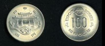 100엔 백동화 | 1967년 2월 1일[35] | 현재 | 표면: 벚꽃 뒷면: 숫자 '100' | 백동 (구리 75%, 니켈 25%) | 22.6mm | 4.8g |