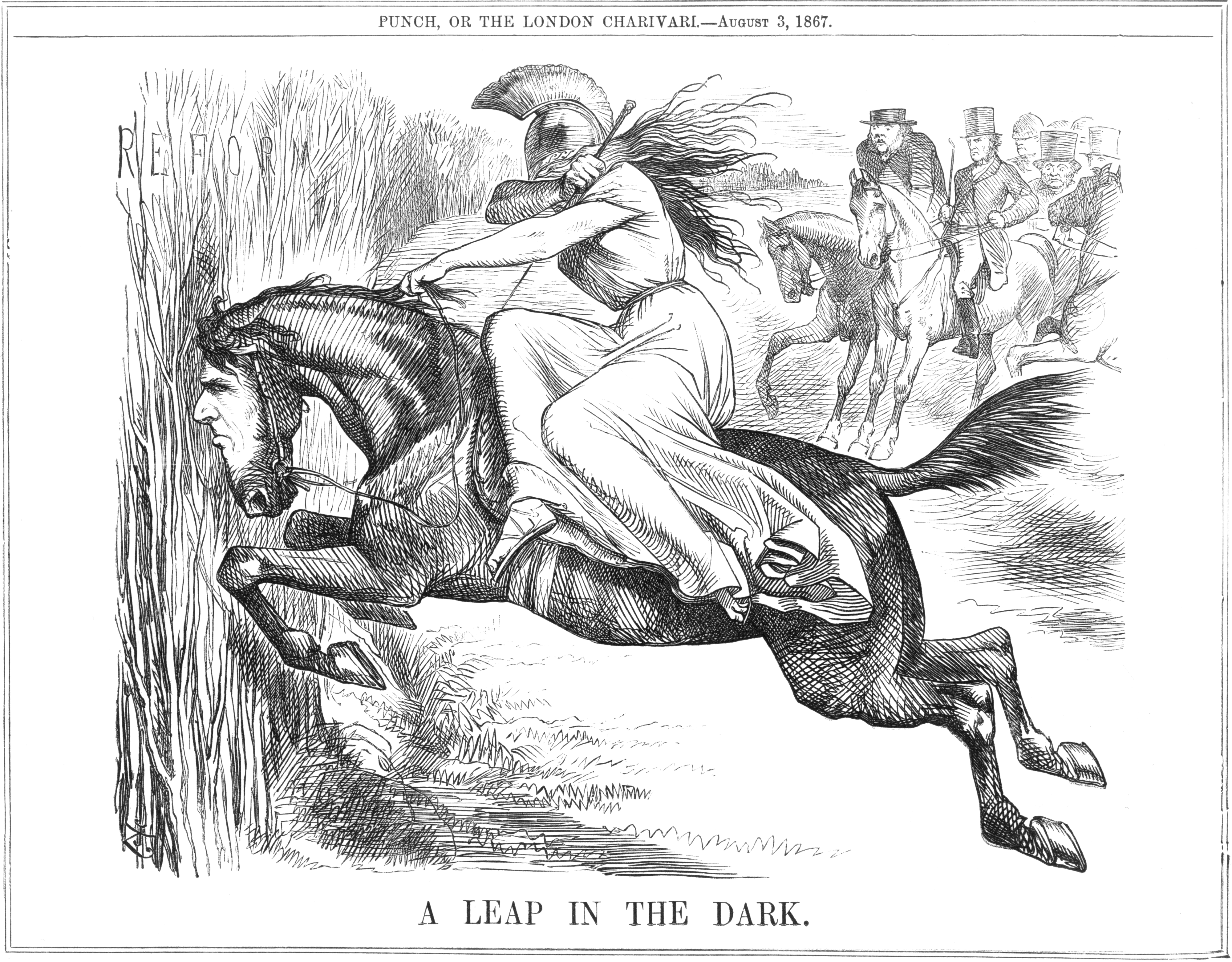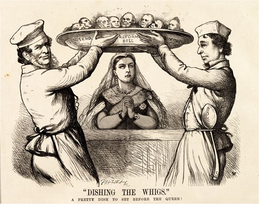 1867년 선거법 개정은 영국 정치 지형에 상당한 변화를 가져왔다. 당시 펀지의 만평은 보수당 소속 더비 경과 벤자민 디즈레일리가 자신들이 본래 의도했던 것보다 더 자유주의적인 개혁을 단행하여 정적인 휘그당을 견제하려는 모습을 풍자적으로 묘사하기도 했다. 이는 개혁의 정치적 배경과 예상치 못한 파급 효과를 상징적으로 보여준다.