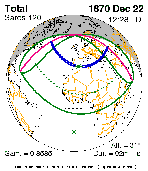 - 일식 시즌: 1870년 12월~1871년 1월 일식 시즌에 속하며, 이 기간 동안 1870년 12월 22일 일식(개기 일식, 태양 사로스 120)과 1871년 1월 월식(부분 월식, 달 사로스 132)이 발생했다.