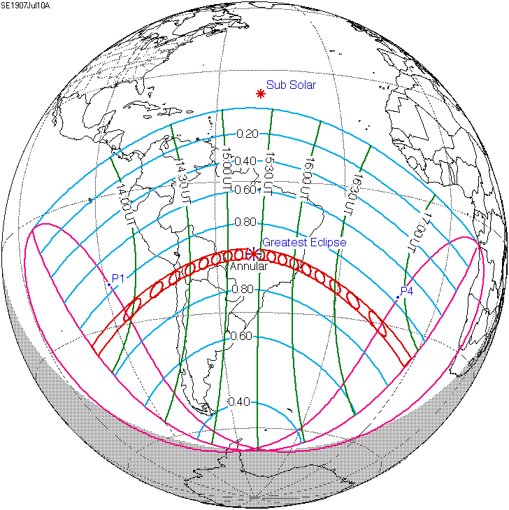 1907년 7월 10일에 발생한 일식에 대한 상세 정보는 아래와 같다. 일식 진행 시간과 관련된 매개변수들을 표로 확인할 수 있다.[6]