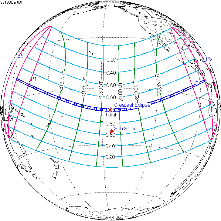 아래 표는 1908년 1월 3일 일식에 관한 세부 정보를 보여준다. 이 표는 달의 반그림자 또는 본그림자가 특정 매개변수에 도달하는 시간을 나타낸다.[9]이벤트 | 시간 (UTC) |
