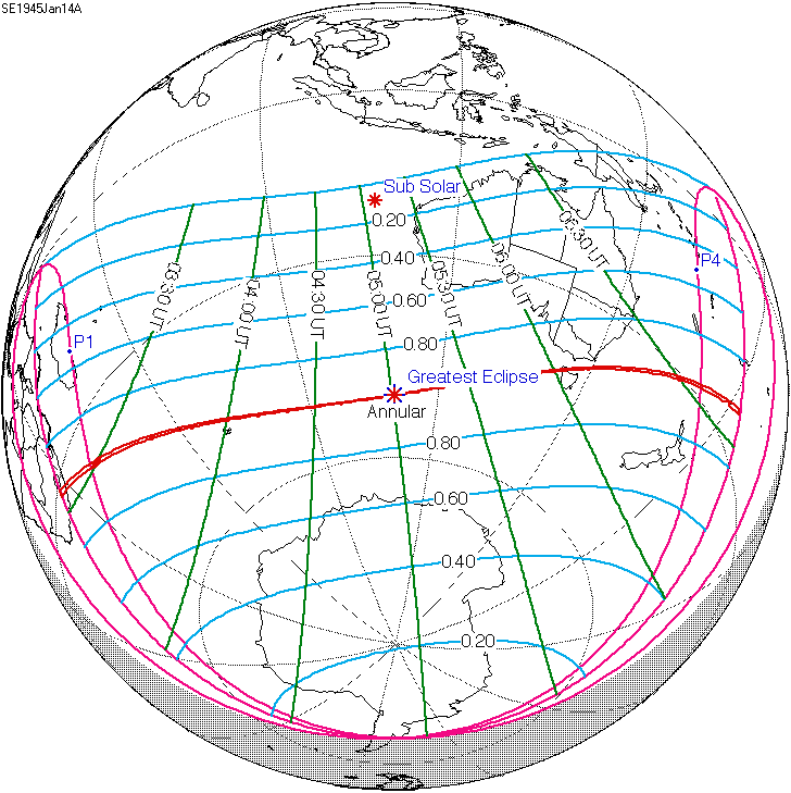 1953년 2월 14일에 발생한 부분 일식은 남극, 남부 호주, 뉴질랜드 등 남반구 지역에서 관측되었으며, 여러 주기와 연쇄에 따라 이전 및 다음 일식과 연결되는 사로스 149 주기의 18번째 일식이다. - 20세기 일식 - 1908년 1월 3일 일식