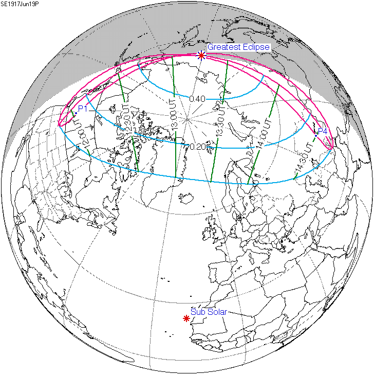 1917년 6월 19일에 발생한 일식의 상세 정보는 다음과 같다.[2] 이 표들은 달의 반그림자 또는 본영이 특정 매개변수에 도달하는 시간과 일식과 관련된 다양한 매개변수를 보여준다.