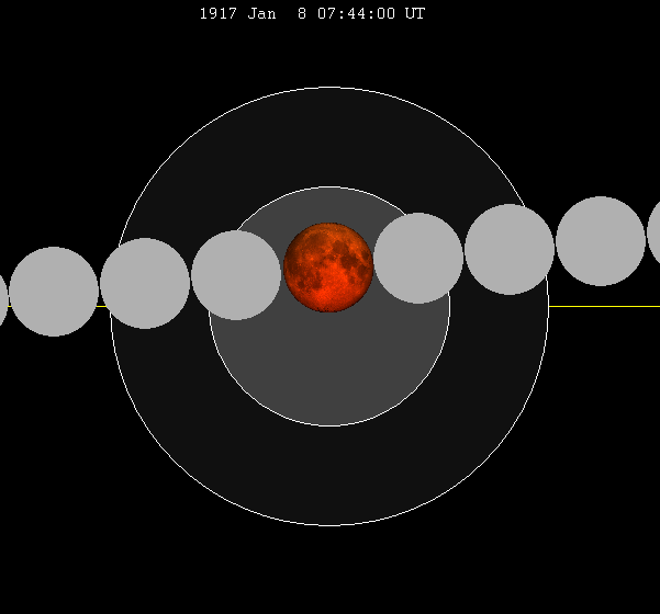 1917년 1월 23일에 일어난 일식에 대한 상세 정보는 다음과 같다. 달의 반그림자 또는 본그림자가 특정 매개변수에 도달하는 시간과 일식과 관련된 다양한 기타 매개변수를 아래의 표에 나타내었다.[2]
