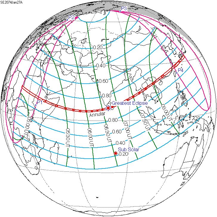 2028년 1월 26일 일식은 금환 일식으로, 남아메리카, 유럽, 아프리카 일부 지역에서 관측 가능하며 사로스 141 주기의 일부이다.