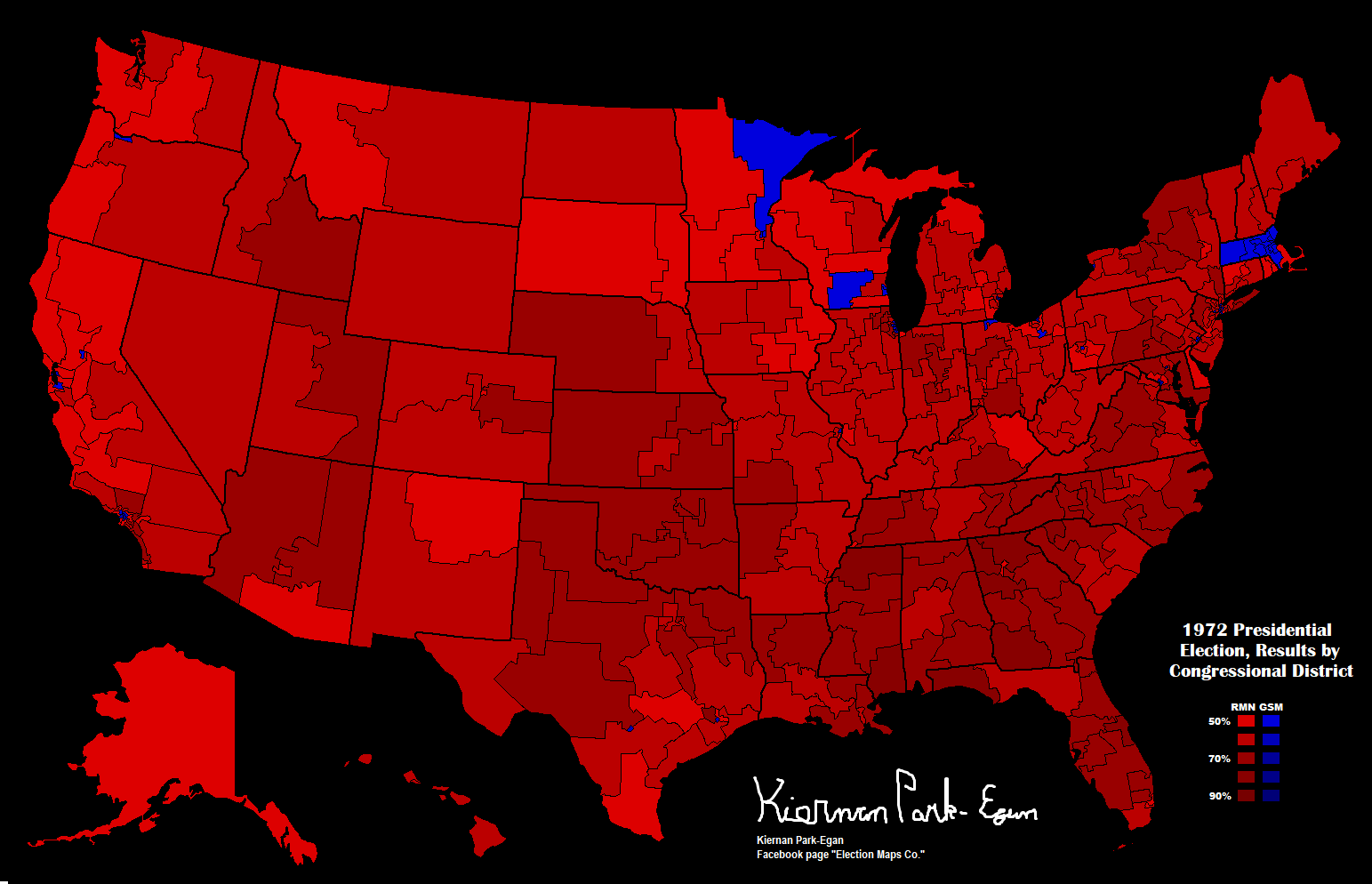 1972년 미국 대통령 선거는 공화당의 리처드 닉슨이 민주당의 조지 맥거번을 상대로 압도적인 승리를 거둔 선거이다. 닉슨은 520명의 선거인단을 확보하며 49개 주에서 승리했고, 맥거번은 매사추세츠와 워싱턴 D.C.에서만 승리했다. 닉슨은 중화인민공화국과의 관계 개선, 소련과의 긴장 완화 등 외교적 성과를 바탕으로 높은 지지를 받았으며, 맥거번은 베트남 전쟁 종식과 빈곤층 지원을 공약했으나 부통령 후보의 중도 사퇴, 민주당 내부의 분열 등으로 어려움을 겪었다. 이 선거는 흑인 유권자들의 표심, 남부 지역의 공화당 지지 확산, 워터게이트 사건의 시작 등 여러 측면에서 미국 정치사에 중요한 영향을 미쳤다.