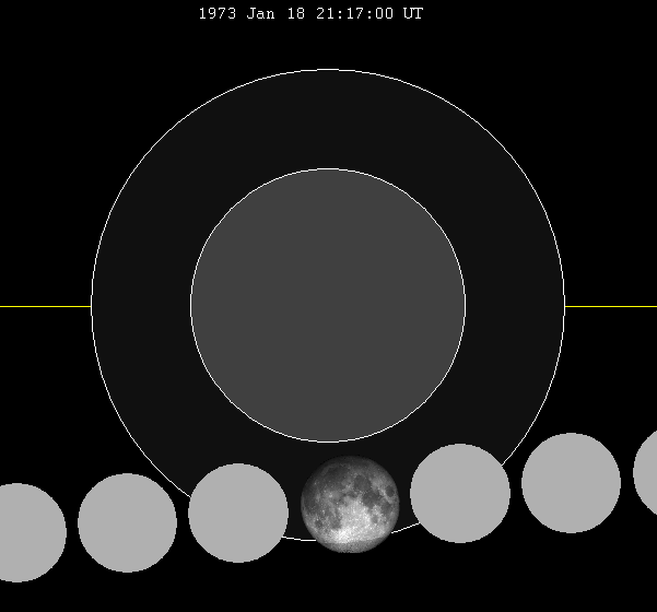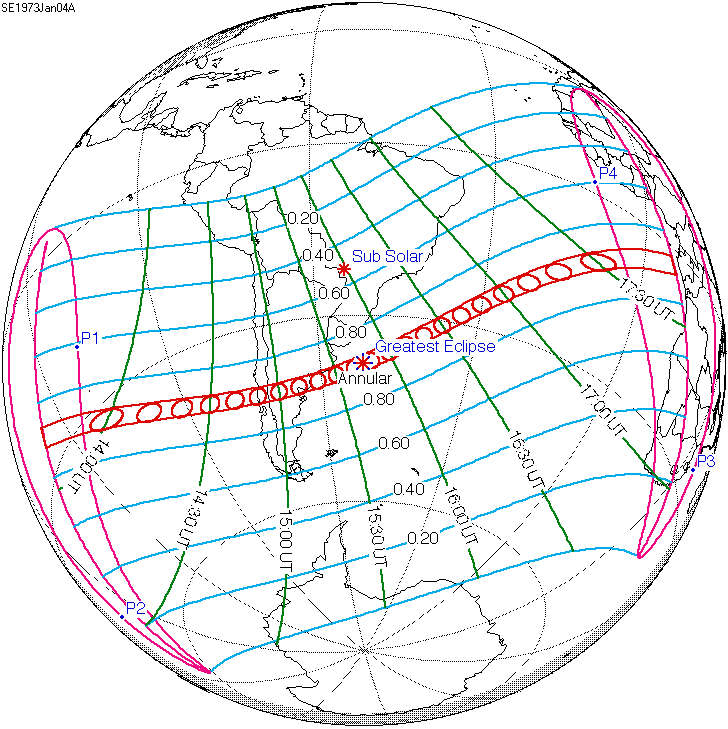1973년 1월 4일 일식은 달의 반그림자 또는 본그림자가 지구 표면에 접촉하는 시간, 그리고 일식의 크기, 가림 정도 등 다양한 매개변수를 포함한다.[3]
