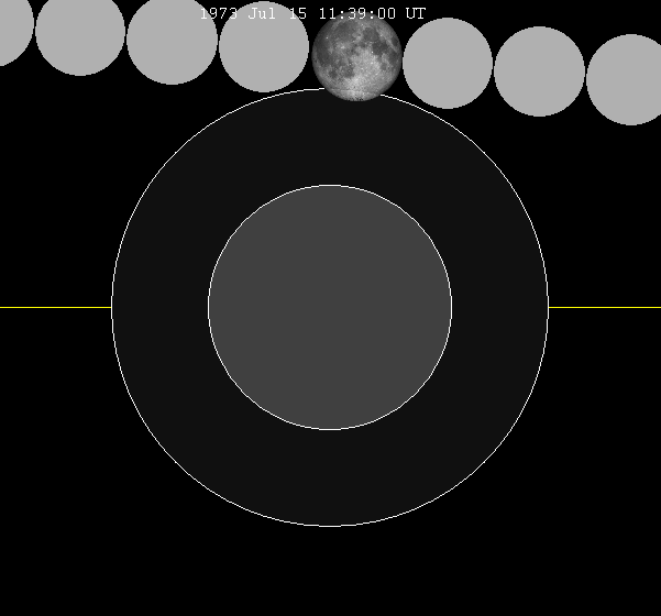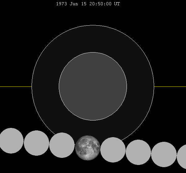 1973년 6월 30일 일식은 달의 반그림자 또는 본그림자가 특정 매개변수에 도달하는 시간과 일식과 관련된 다양한 매개변수를 포함한 상세 정보가 제공된다.[12]
