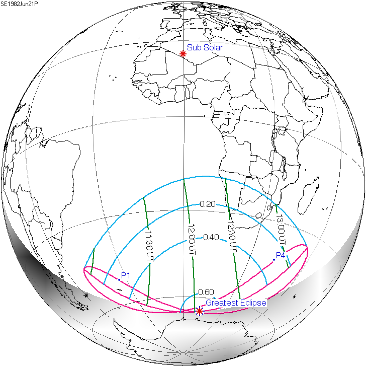 1982년 6월 21일부터 2058년 6월 21일까지 21번의 일식 이벤트