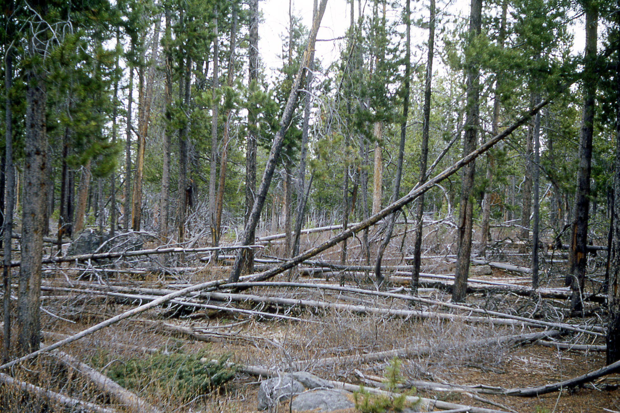 옐로스톤 국립공원 숲은 잣나무가 주종을 이루며, 숲이 성숙해짐에 따라 80~100년이 지나면 다른 수종으로 대체된다.[23] 옐로스톤에서는 고도가 높고 토양이 비교적 척박하여 생육 기간이 매우 짧기 때문에 잣나무가 엥겔만 가문비나무나 고산 구상나무와 같은 다른 나무들이 자리를 잡기 전에 300년에 가까운 수명을 누릴 수 있다.[23] 옐로스톤 고원 고지대에서 발견되는 잣나무는 다양한 무리에서 비슷한 수령을 보이는 방해받지 않는 밀집된 숲을 이루며 자란다. 더 성숙한 숲에서 일반적으로 발견되는 나무들도 있지만, 로키 산맥의 다른 숲처럼 큰 군락을 이루지는 않는다. 1980년대까지 옐로스톤의 잣나무 숲 대부분은 수령이 200~250년 사이였으며 수명 주기의 끝에 다다르고 있었다.[22]산소나무딱정벌레는 1960년대 후반부터 1980년대 중반까지 그레이터 옐로스톤 생태계에서 많은 나무를 죽였다. 이로 인해 오래된 생존 나무와 다양한 연령대의 어린 나무가 섞여 있는 이질적인 숲이 조성되었다. 이러한 혼합된 숲 구조는 화재에 기여한 사다리 연료를 제공했을 수 있다.[24]