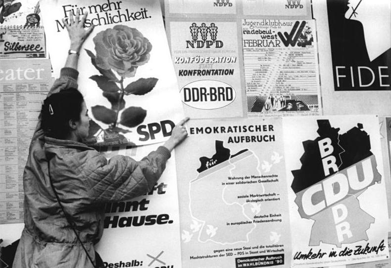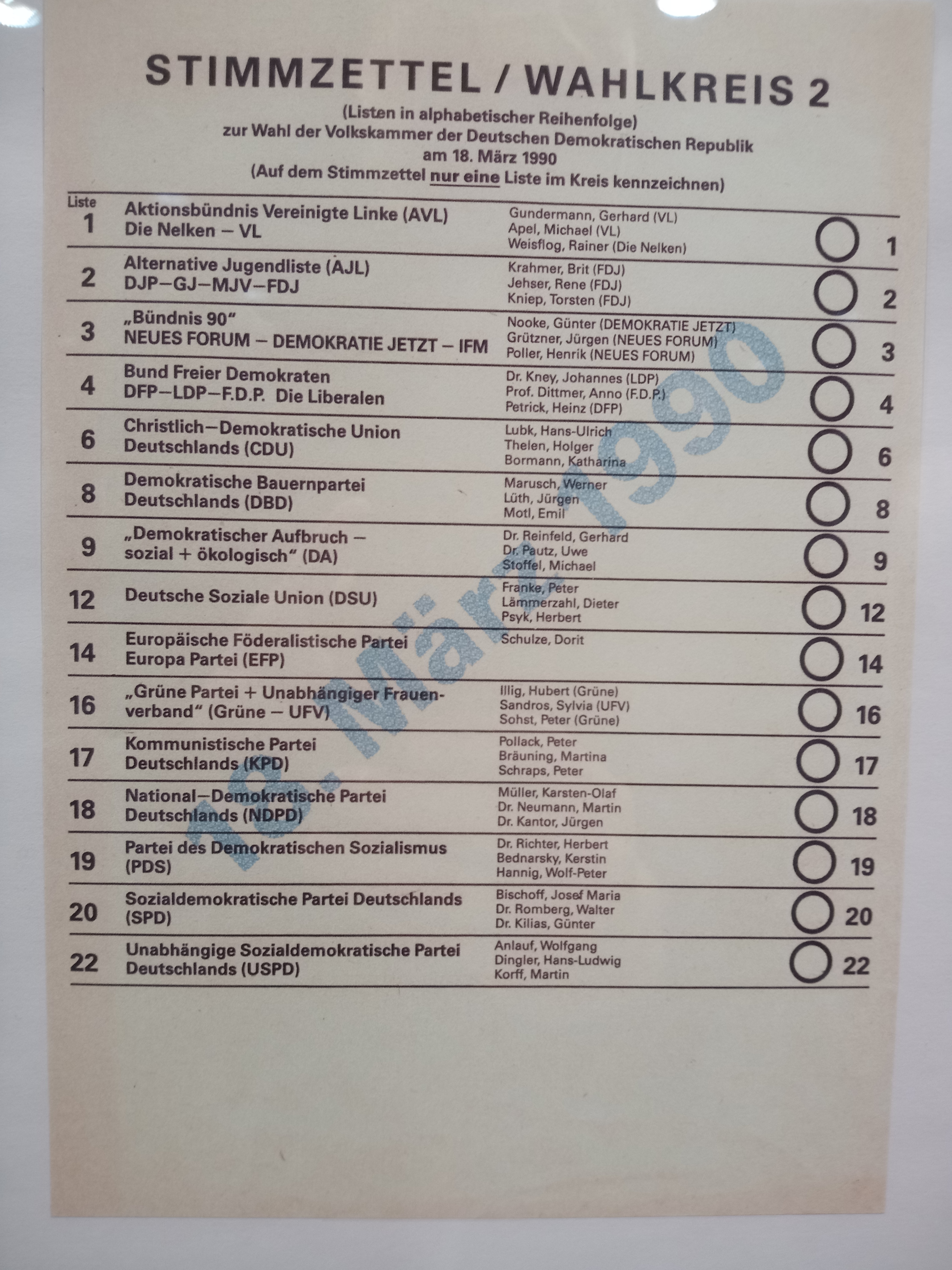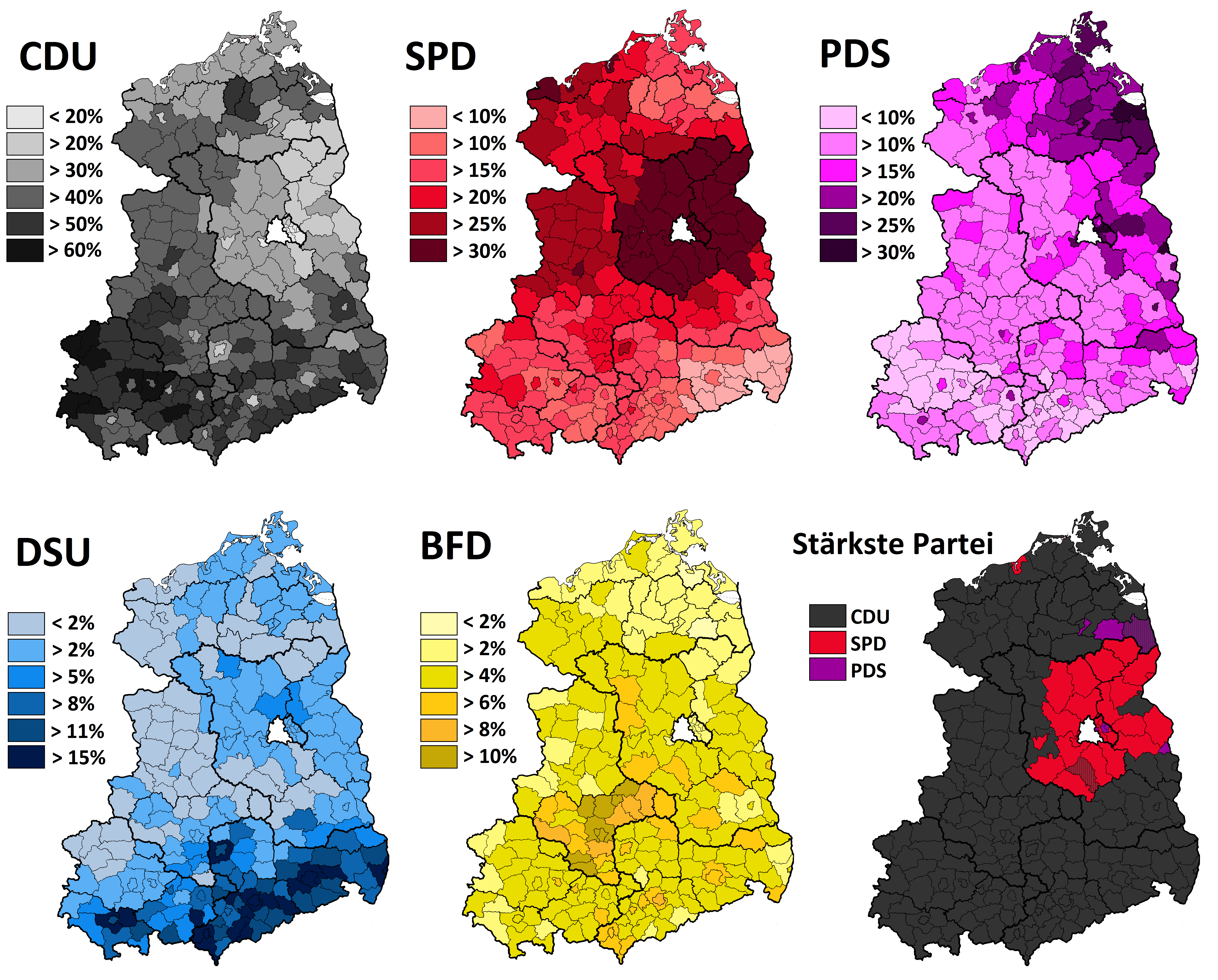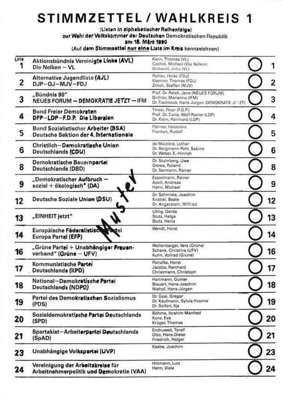 1990년 동독 총선거에서 독일을 위한 동맹은 48.0%의 득표율로 192석을 확보하여 승리하였다. 사회민주당은 21.9%의 득표율로 88석, 민주사회당은 16.4%의 득표율로 66석을 얻었다. 자유민주협회는 5.3%의 득표율로 21석, 동맹 90은 2.9%의 득표율로 12석을 확보했다. 기타 정당들은 소수의 의석을 얻거나 의석 확보에 실패했다.[17]