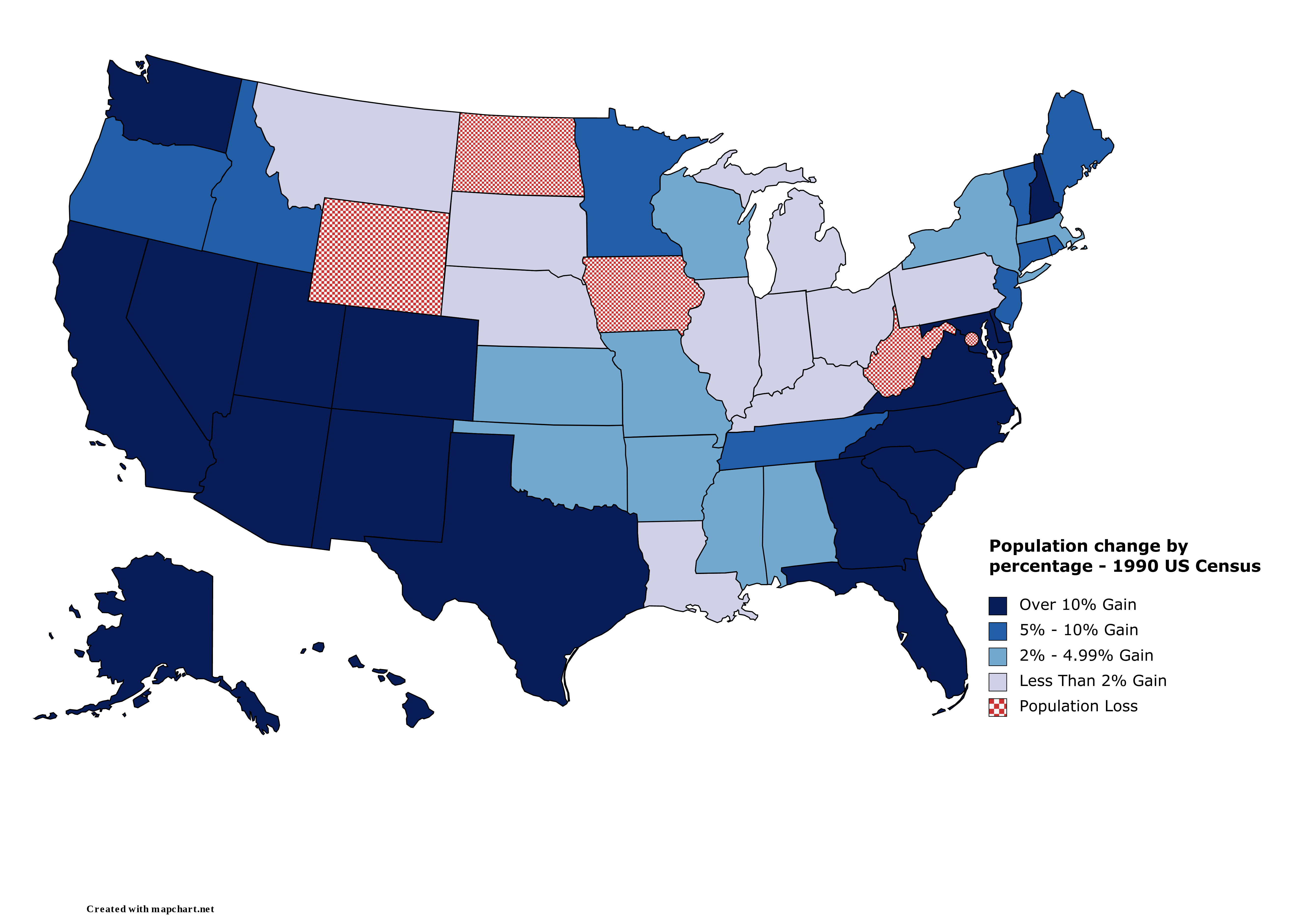 1980년 미국 인구 조사와 비교하여, 1990년 미국 인구 조사에서는 전체 인구가 226,545,805명에서 248,709,873명으로 9.8% 증가하였다. 각 주의 인구 변화는 다음과 같다.