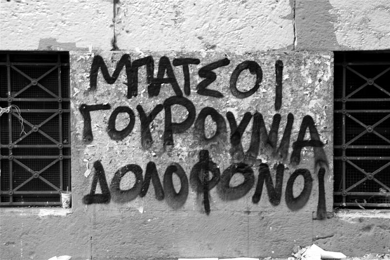 파네피스티미우 거리의 낙서 (번역: "경찰, 돼지, 살인자")