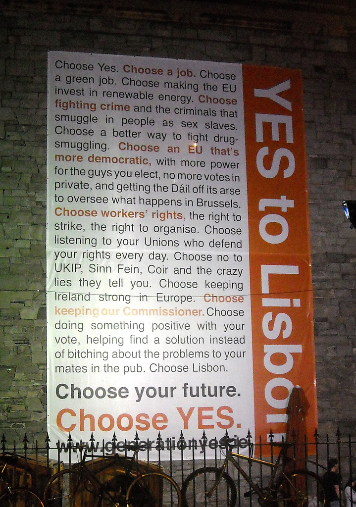 2009년 아일랜드 국민투표에서 찬성 측은 피아나 페일, 피네 게일, 노동당, 녹색당 등 주요 정당들과 인텔, 라이언에어 등 기업들이 주도했다. 특히, 경제 위기 상황에서 EU의 지원을 받기 위한 경제적 이유가 강조되었다. 유럽을 위한 아일랜드, 제너레이션 예스(Generation Yes) 등 시민 단체들도 찬성 운동에 참여했다.