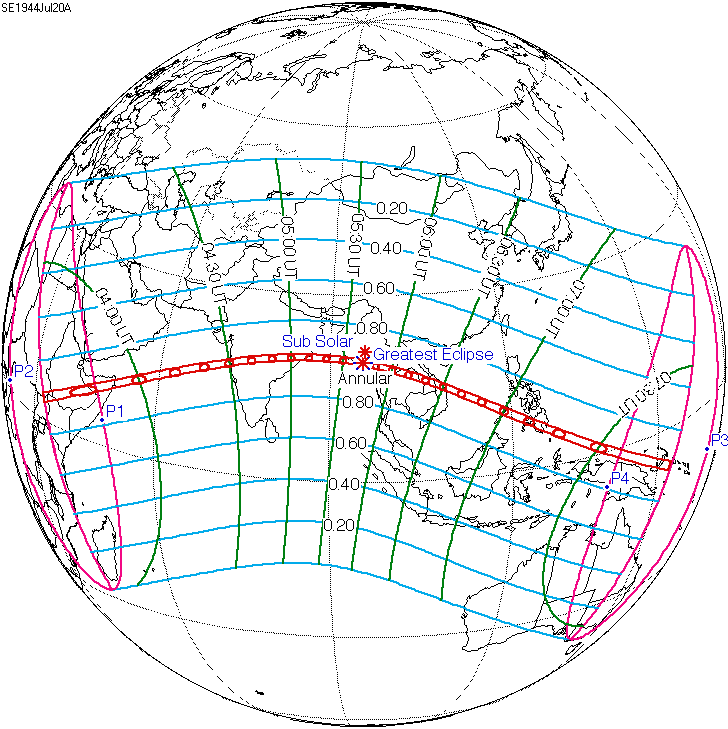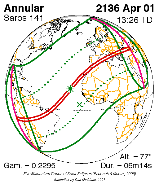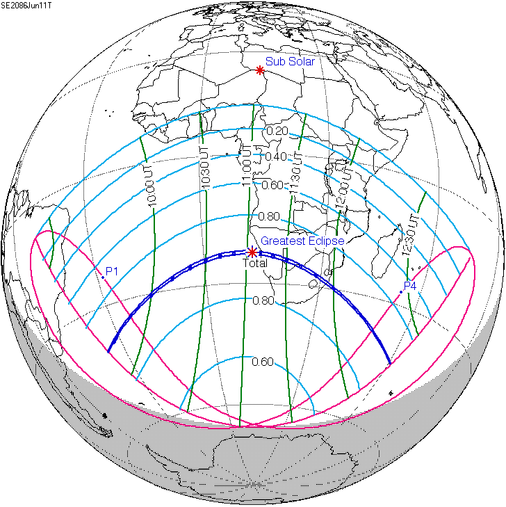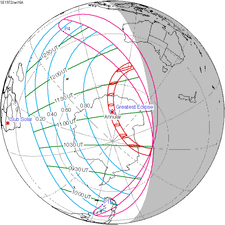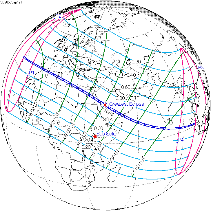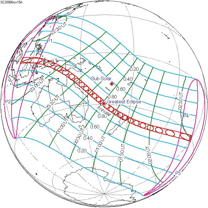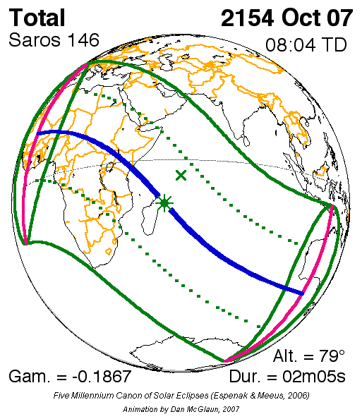 일식은 중앙아프리카공화국과 차드 국경 근처에서 시작되어 콩고민주공화국, 우간다, 케냐를 통과하고 탄자니아의 북쪽 끝, 소말리아 남서부, 세이셸의 세 섬(버드 섬, 데니스 섬, 아리드 섬)을 지나 인도양으로 진입하여 최대 가시도에 도달했다.[8] 이후 몰디브를 통과했는데, 몰디브의 수도인 말레에서의 금환일식은 현지 시간(UTC+5)으로 12시 20분 17초에 시작하여 12시 31분 2초에 끝났으며, 10분 45초(645초) 동안 지속되었다.[8][17] 이는 국제공항이 지나는 경로 중 가장 긴 시간 지속된 일식이기도 하다.[8]