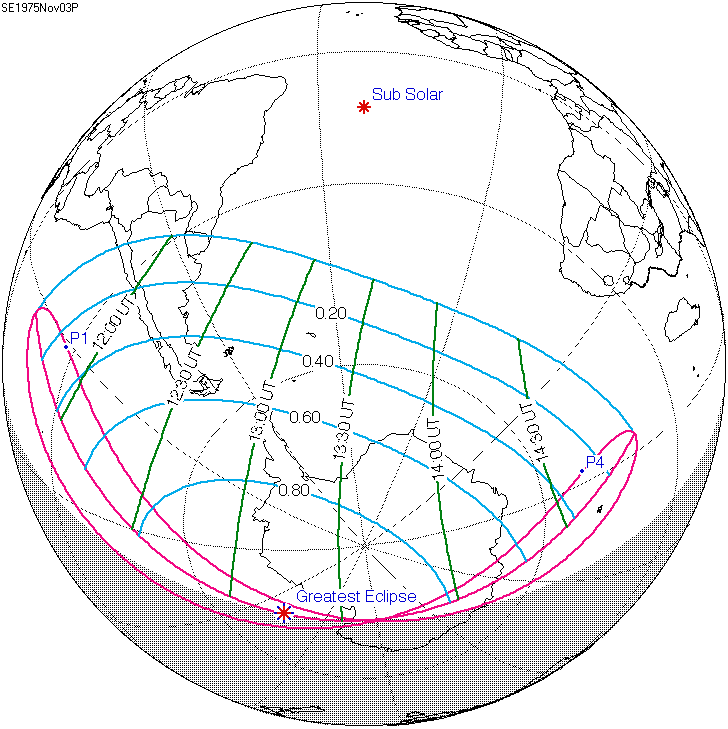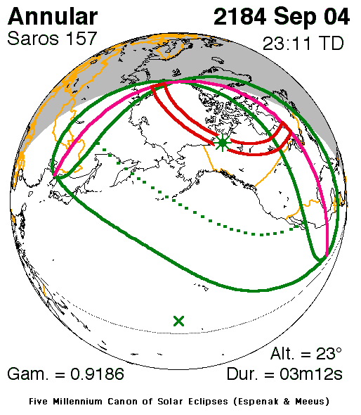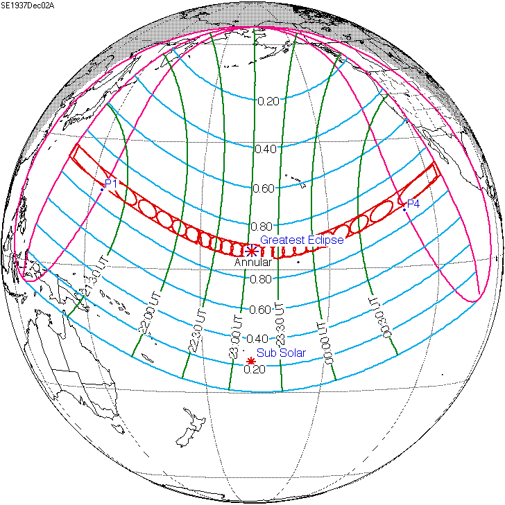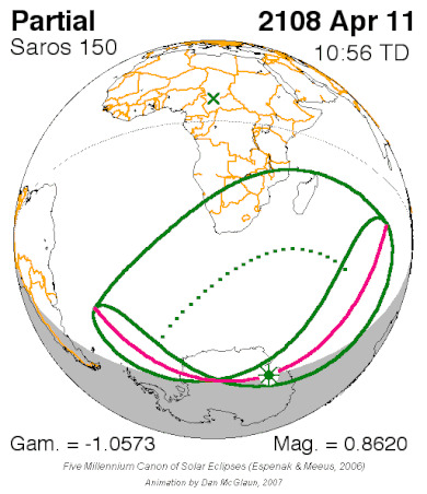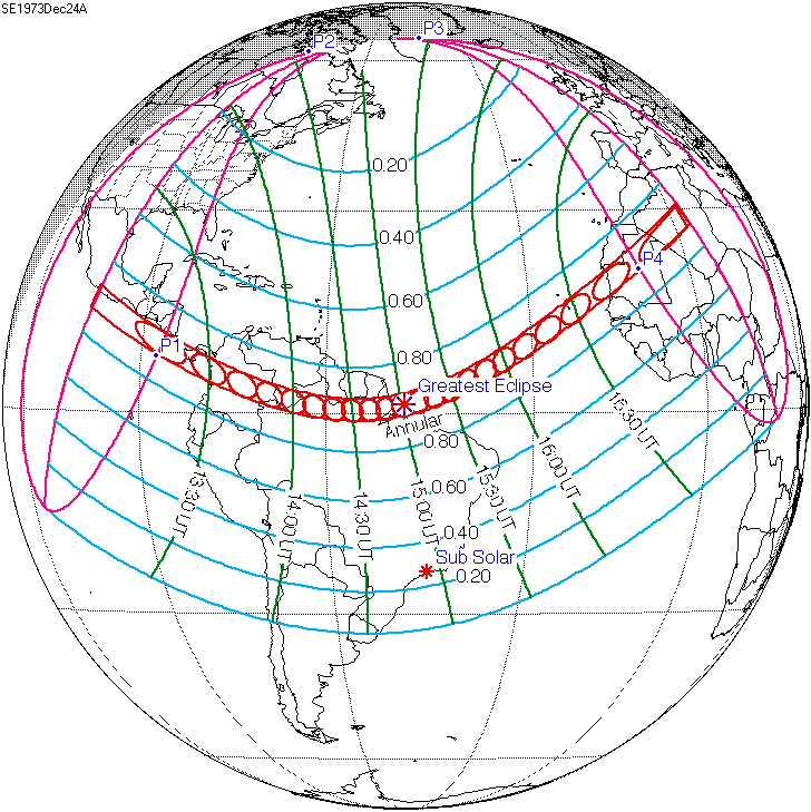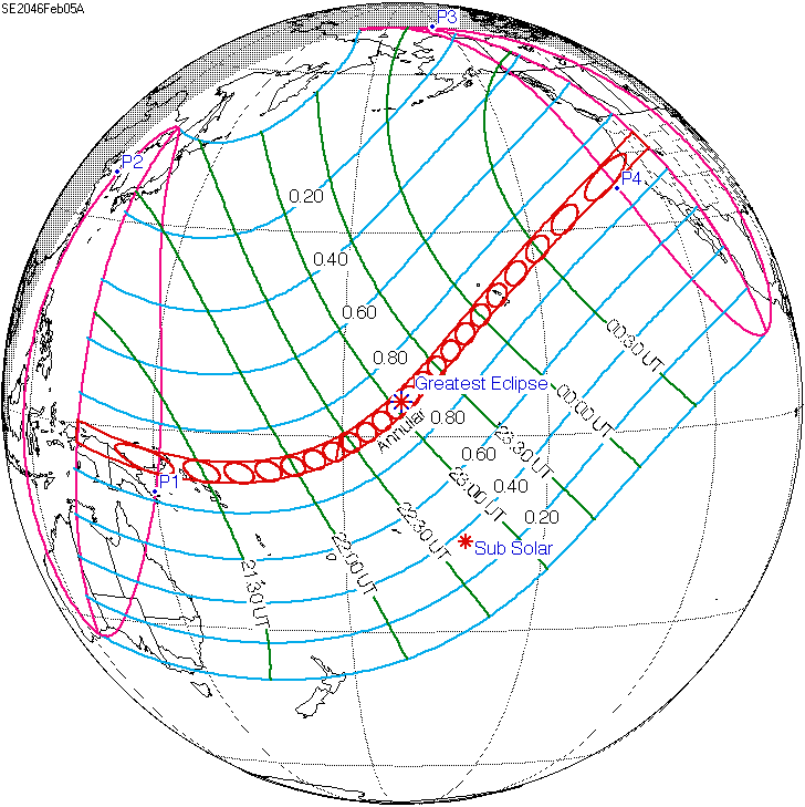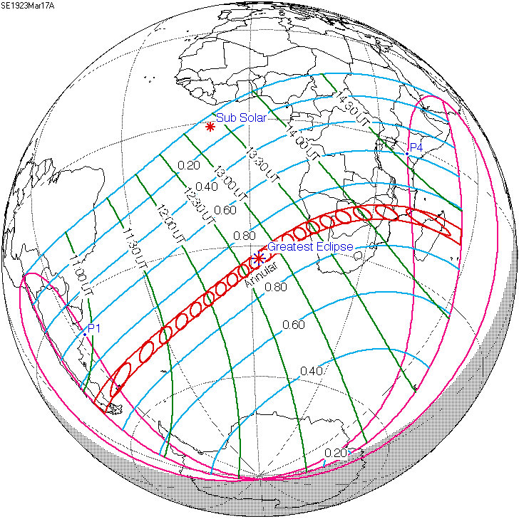 일식은 중앙아프리카공화국과 차드 국경 근처에서 시작되어 콩고민주공화국, 우간다, 케냐를 통과하고 탄자니아의 북쪽 끝, 소말리아 남서부, 세이셸의 세 섬(버드 섬, 데니스 섬, 아리드 섬)을 지나 인도양으로 진입하여 최대 가시도에 도달했다.[8] 이후 몰디브를 통과했는데, 몰디브의 수도인 말레에서의 금환일식은 현지 시간(UTC+5)으로 12시 20분 17초에 시작하여 12시 31분 2초에 끝났으며, 10분 45초(645초) 동안 지속되었다.[8][17] 이는 국제공항이 지나는 경로 중 가장 긴 시간 지속된 일식이기도 하다.[8]