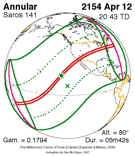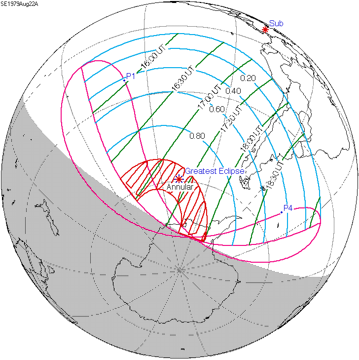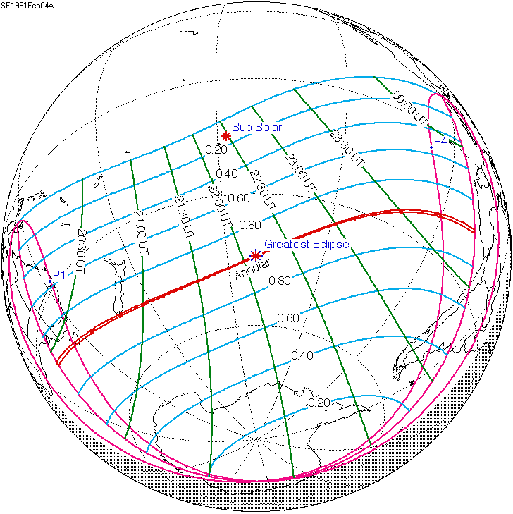일식은 중앙아프리카공화국과 차드 국경 근처에서 시작되어 콩고민주공화국, 우간다, 케냐를 통과하고 탄자니아의 북쪽 끝, 소말리아 남서부, 세이셸의 세 섬(버드 섬, 데니스 섬, 아리드 섬)을 지나 인도양으로 진입하여 최대 가시도에 도달했다.[8] 이후 몰디브를 통과했는데, 몰디브의 수도인 말레에서의 금환일식은 현지 시간(UTC+5)으로 12시 20분 17초에 시작하여 12시 31분 2초에 끝났으며, 10분 45초 동안 지속되었다.[8][17] 이는 국제공항이 지나는 경로 중 가장 긴 시간 지속된 일식이기도 하다.[8]