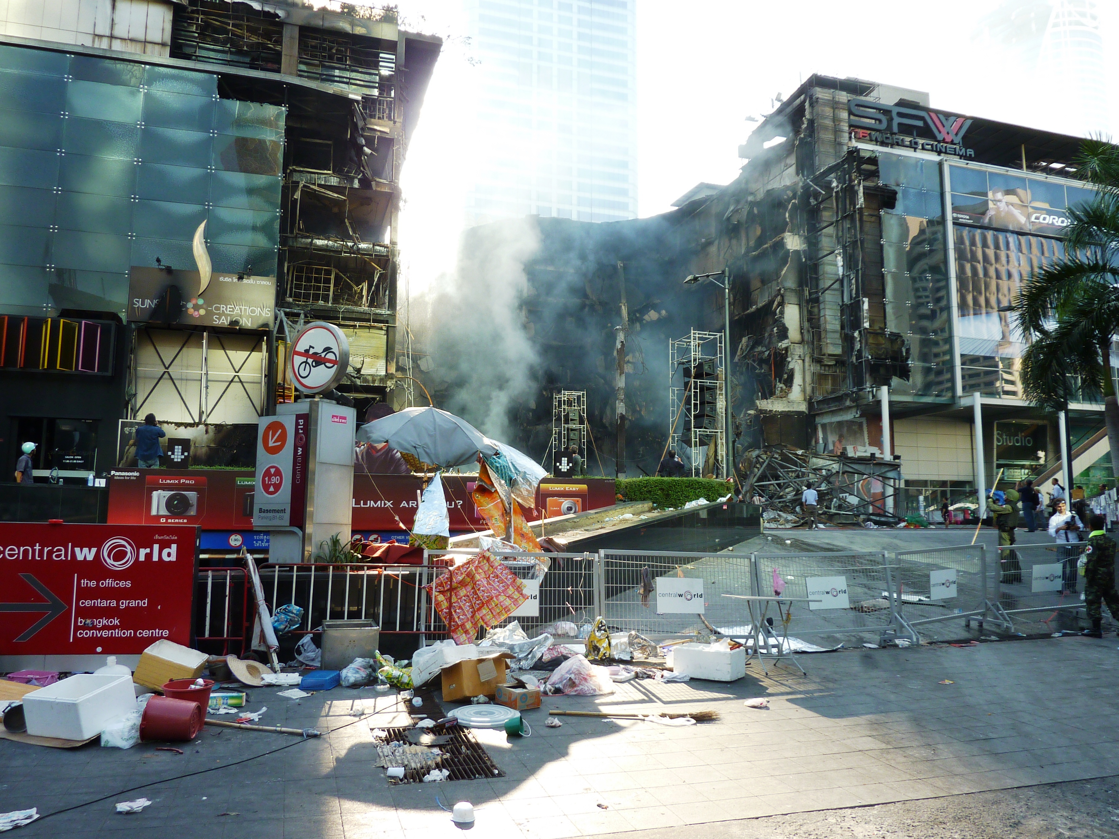 5월에는 군부의 진압이 더욱 강화되었다. 5월 13일, 시위대 보안 고문 카티야 사와스디폰 장군이 저격수의 총에 맞아 사망했다. 군대는 해당 지역을 "자유 발포 구역"으로 선언하고 시위대를 향해 무차별 발포했다. 5월 19일, 군은 장갑차를 동원해 시위대를 진압했고, UDD 지도부는 항복했다. 시위 진압 후, 센트럴 월드를 포함한 여러 건물에서 방화 사건이 발생했다.