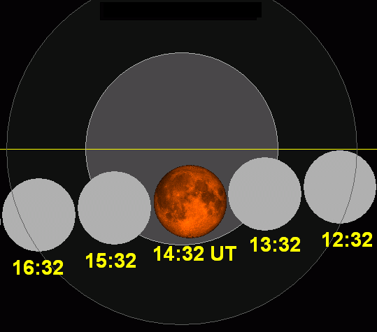 개기 월식은 동아시아, 북아시아, 오스트레일리아 전역과 북부 북아메리카에서 완전히 관측 가능했으며, 유럽과 동아프리카 및 중앙 아프리카에서는 월식이 뜨는 모습을, 북아메리카에서는 지는 모습을 관측할 수 있었다.[3]![]() | ![]() | ![]() |