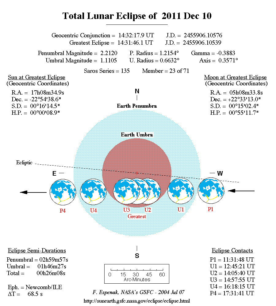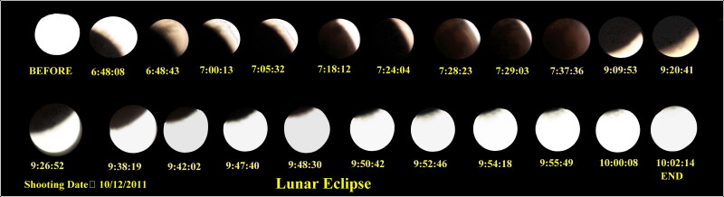 2011년 12월 10일에 발생한 개기 월식은 지역에 따라 관측 시간이 달랐다.[7][8]