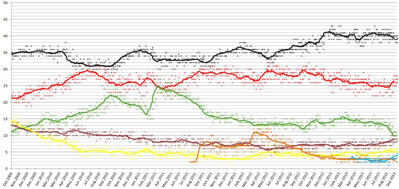 2009년 독일 연방의회 선거에서 기독교민주연합/기독교사회연합과 자유민주당이 과반 의석을 차지하여 앙겔라 메르켈 총리가 재집권하고 기민련/기사련-자민당 연립 정부가 출범했으며, 사회민주당은 참패, 좌파당과 녹색당은 약진했다. - 2013년 선거 - 2013년 파라과이 대통령 선거