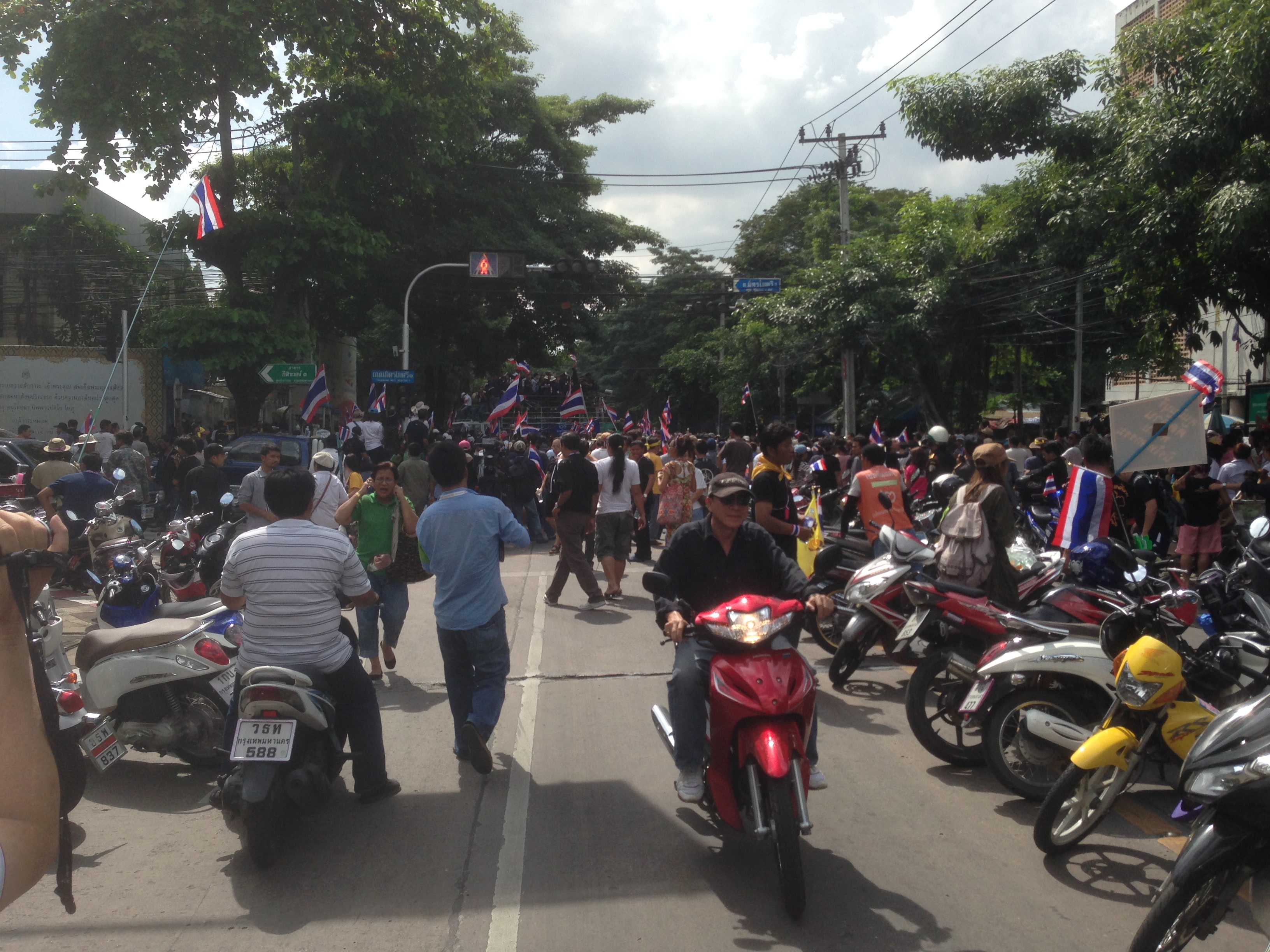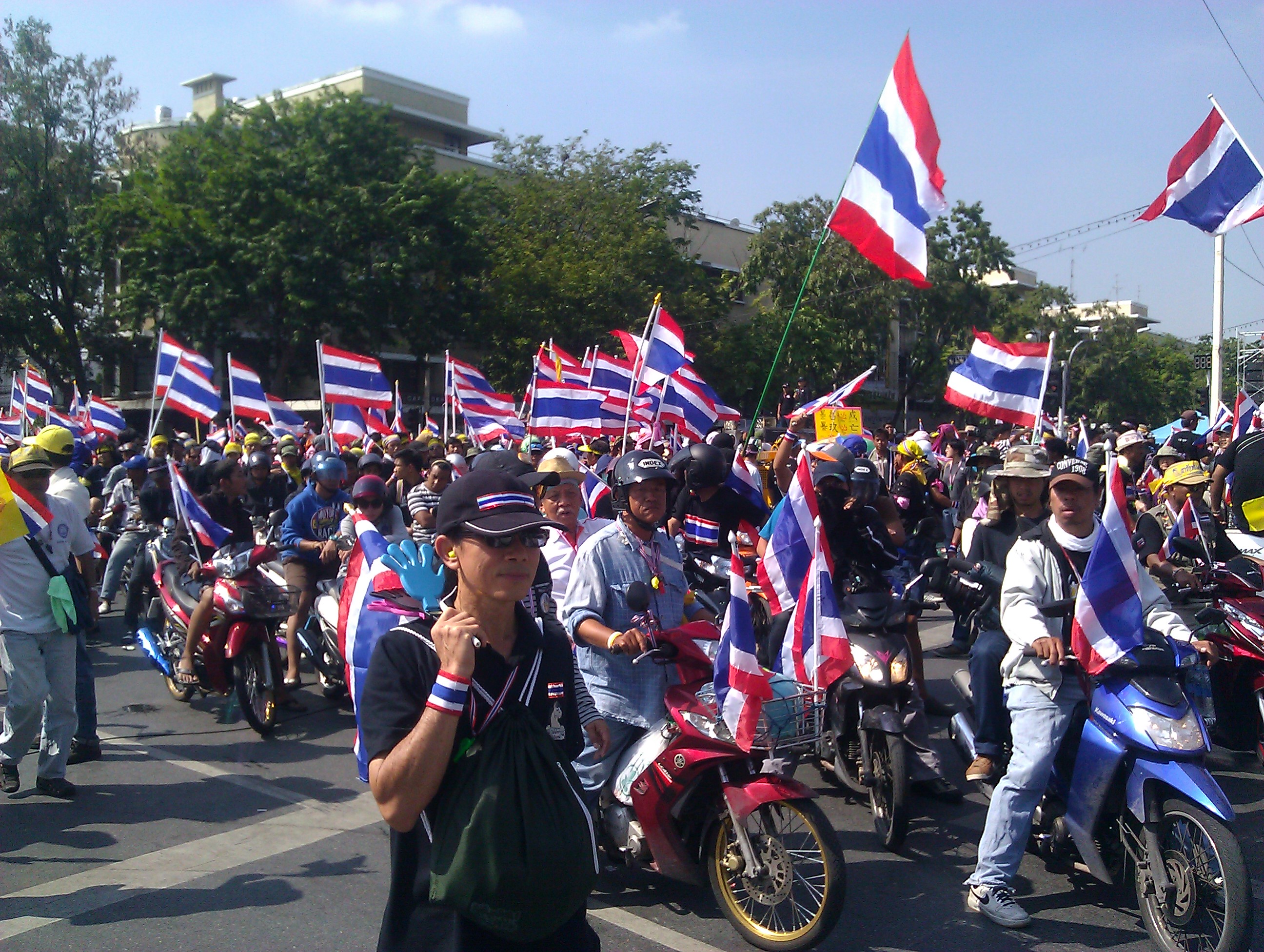 2013년 11월 25일, 수텝 타우그수반이 이끄는 민주개혁위원회(PDRC)의 반정부 시위대는 여러 정부 청사로 행진하여 재무부, 예산국, 외무부, 공보부 등을 점거했다.[282] 잉락 친나왓 총리는 방콕과 주변 지역에 내부 보안법(ISA)을 발동했다.[282]11월 30일, 시위대는 CAT 텔레콤과 TOT 사무실에 침입하여 인터넷 서비스를 방해했다.[282] 같은 날, 람캄행 대학교 학생들과 '레드 셔츠' 지지자들 간의 폭력 사태가 발생했다.[282] 12월 1일, 수텝 타우그수반은 '인민 쿠데타'를 통해 잉락 정부를 전복하겠다고 선언했다.[282] 시위대는 총리 공관과 수도 경찰청 진입을 시도했으나 경찰에 저지되었고, 잉락 총리는 시위대에 포위되자 공개되지 않은 장소로 이동했다.[282] 수텝 타우그수반은 잉락 총리에게 사임을 요구하는 최후 통첩을 전달했다.[282]