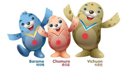 마스코트는 백령도에 서식하는 점박이물범을 모티브로 한 비추온(Vichuon), 바라메(Barame), 추므로(Chumuro)이다. 2010년 11월 4일 인천 송도에서 공개된 이 세 마스코트는 한국어로 바람, 춤, 빛을 뜻하며, 메인 경기장의 테마를 따라 선택되었다. 조직위원회는 이들이 남북한 간의 미래 평화를 상징한다고 밝혔다. 비추온은 맏이, 바라메는 둘째, 추므로는 막내이자 유일한 여자아이이다.[27][28]