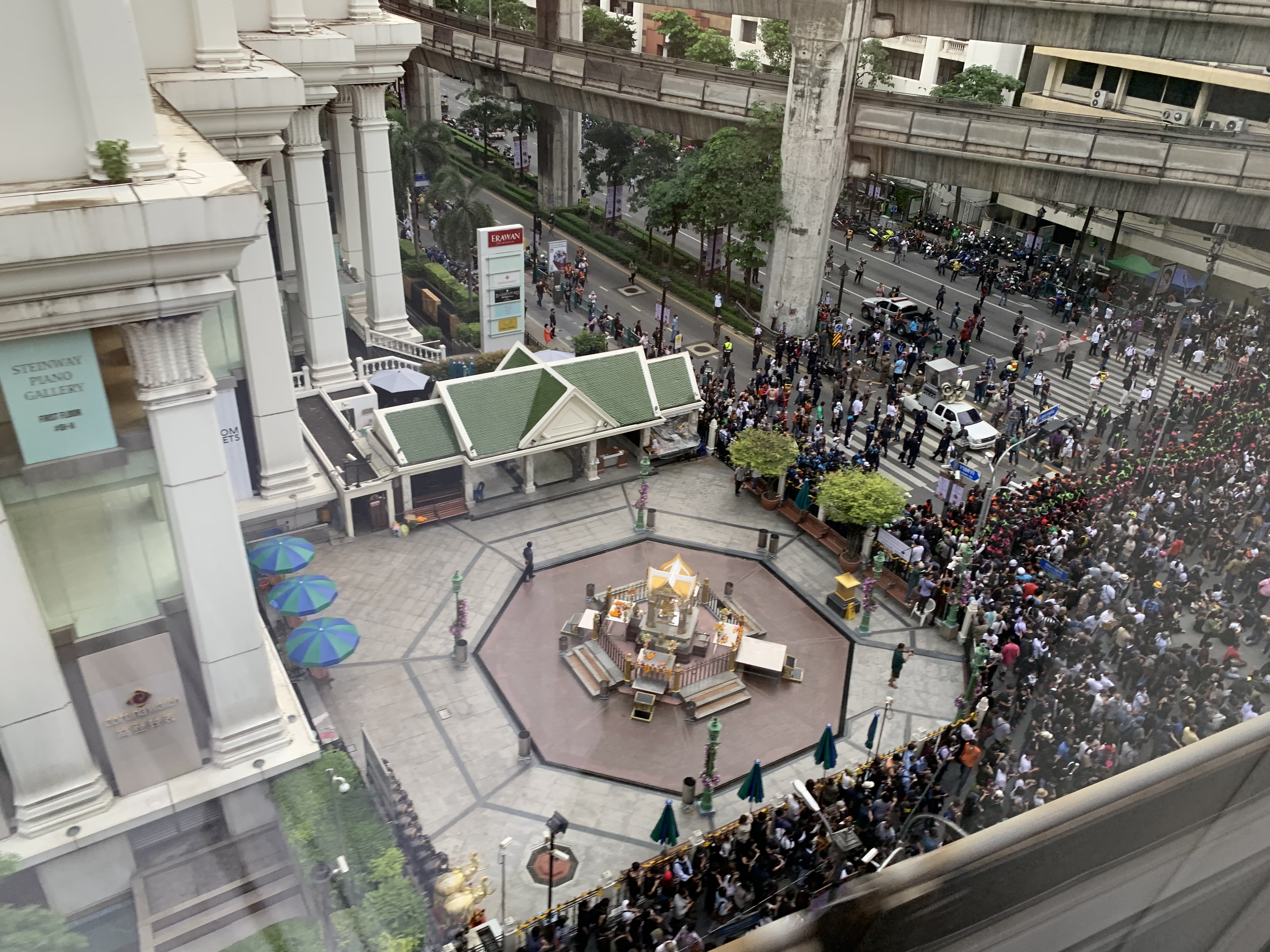 태국 시각 2015년 8월 17일 18시 56분 (UTC 11시 56분) 경, 방콕 도심 에라완 사원 근처 사람들로 붐비던 라차프라송 교차로에서 폭탄이 폭발했다.[103]솜욧 품판무앙 경찰총장은 에라완 사원 근처 의자에 설치된 TNT 3kg의 사제 파이프 폭탄이 터졌으며, 이 폭탄의 파괴력이 반경 100m에 미쳤다고 발표했다. 태국 정부 대변인 웨라촌 수콘다파티팍은 "아직 자신들의 소행이라고 자처하는 단체가 나오지 않고 있어 이번 폭발을 테러 공격으로 연결시키기는 이르다"고 말했다.