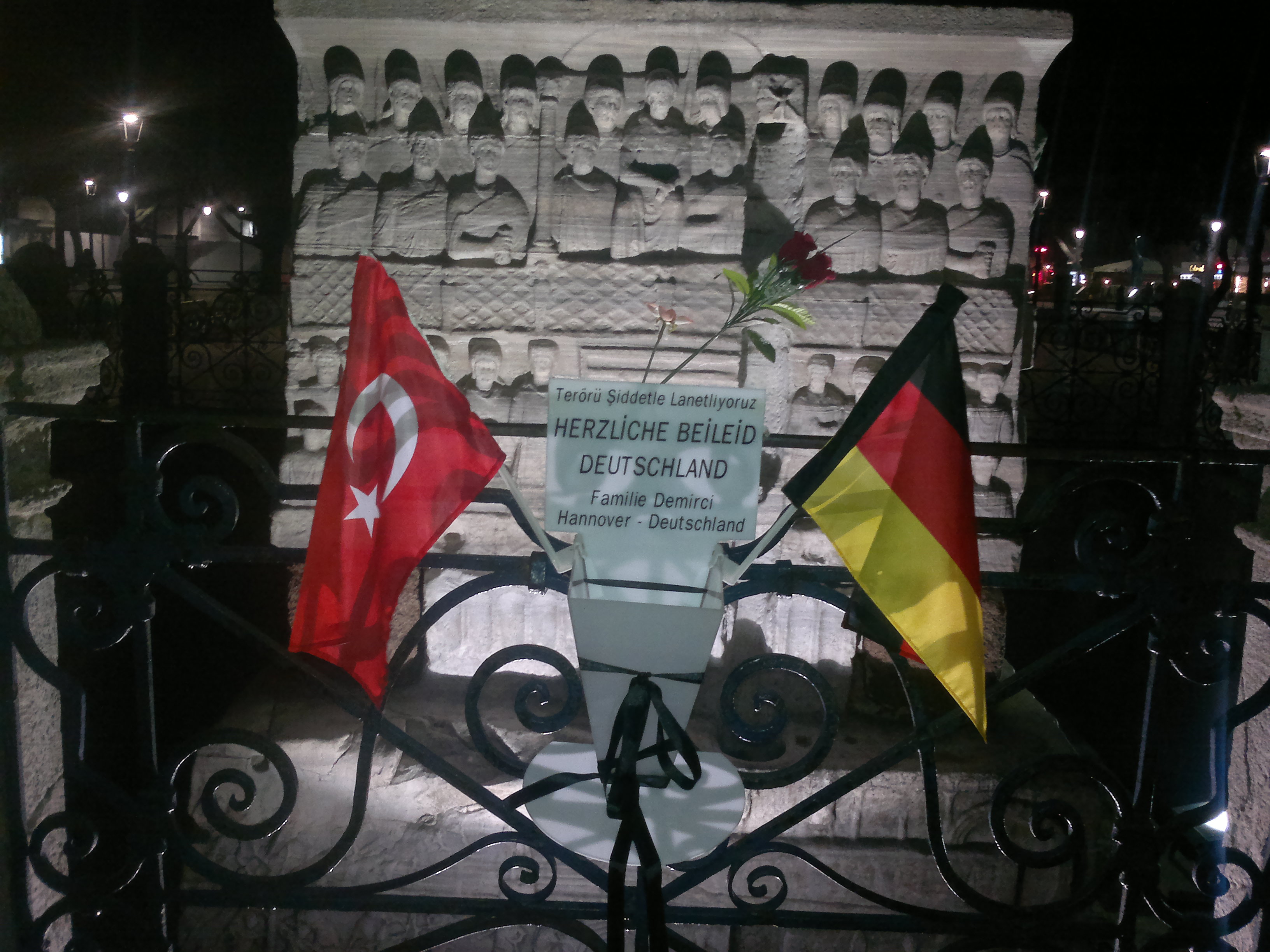 - : 앙겔라 메르켈 독일 총리는 "심각한 우려"를 표명하며 "독일 관광객 단체가 피해를 입었다"고 말했다.[9] 독일 외무부는 웹사이트를 통해 이스탄불에 있는 독일 관광객들에게 많은 군중과 관광 명소를 피하고 터키 전역에서 추가적인 폭력 충돌과 "테러 공격"이 예상된다고 경고했다.[9]