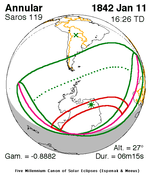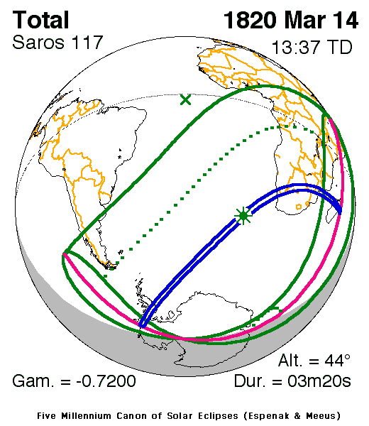 이 일식은 135 삭망월(≈ 3986.63일, 즉 11년 1개월 덜됨)마다 교대로 발생하는 트리토스 주기의 일부이다. 항성월(근지점 주기)과의 동기화 부족으로 인해 출현과 경도가 불규칙하지만, 3개의 트리토스 주기(≈ 33년 3개월 덜됨)의 그룹(≈ 434.044 항성월)이 근접하므로, 이 그룹 내의 일식은 유사하다.1801년에서 2200년 사이의 트리토스 주기 일식은 다음과 같다.