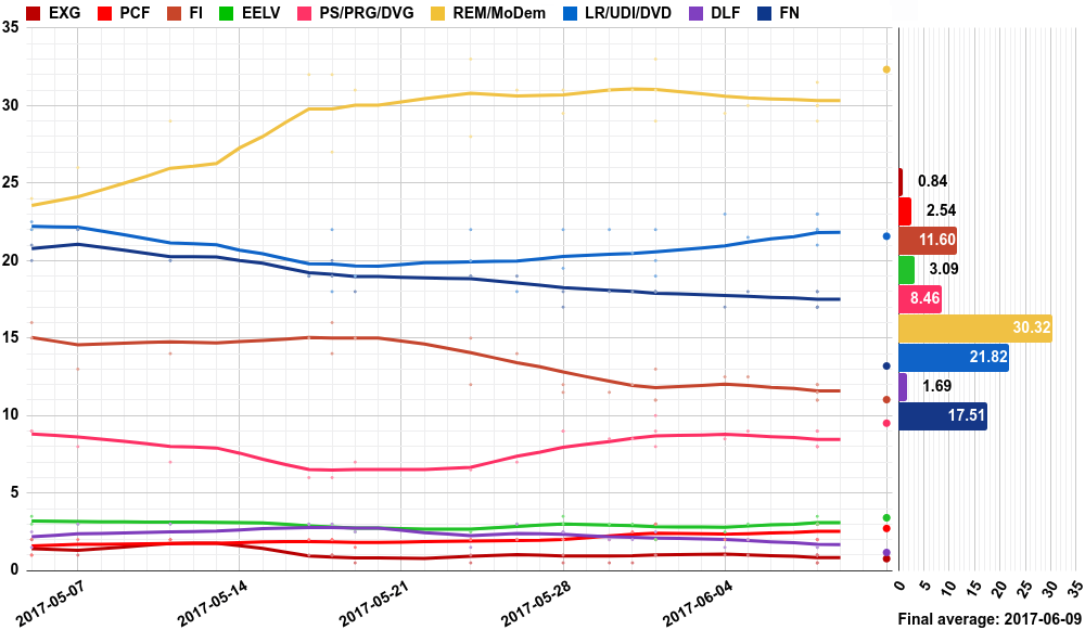 2017년 6월 11일에 실시된 1차 투표 결과, 에마뉘엘 마크롱 대통령의 중도 신당 '공화국 전진'과 협력 정당인 민주운동이 32.3%의 유효표를 얻었고, 공화당은 15.7%, 프랑수아 올랑드 전 대통령의 여당인 사회당은 7.4%에 그쳤다.[98] 1차 투표에서 당선자가 결정되지 않은 573개 선거구에서 6월 18일에 실시된 결선 투표에서는 공화국 전진이 308석을 획득, 협력 정당인 민주운동과 합쳐 350석이 되어 국민 의회의 60%를 차지하며 압승을 거두었다. 그에 반해, 공화당을 비롯한 중도 우파는 137석, 사회당 등 중도 좌파 계열은 45석에 그쳐, 이전의 양대 정당이 크게 의석을 잃는 결과를 낳았다.[99]