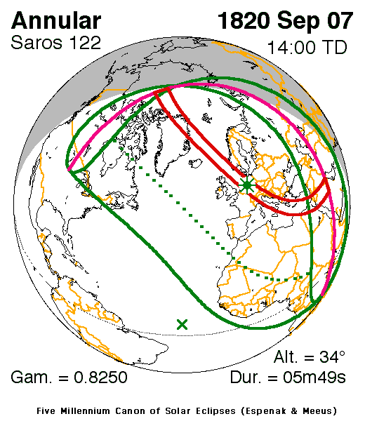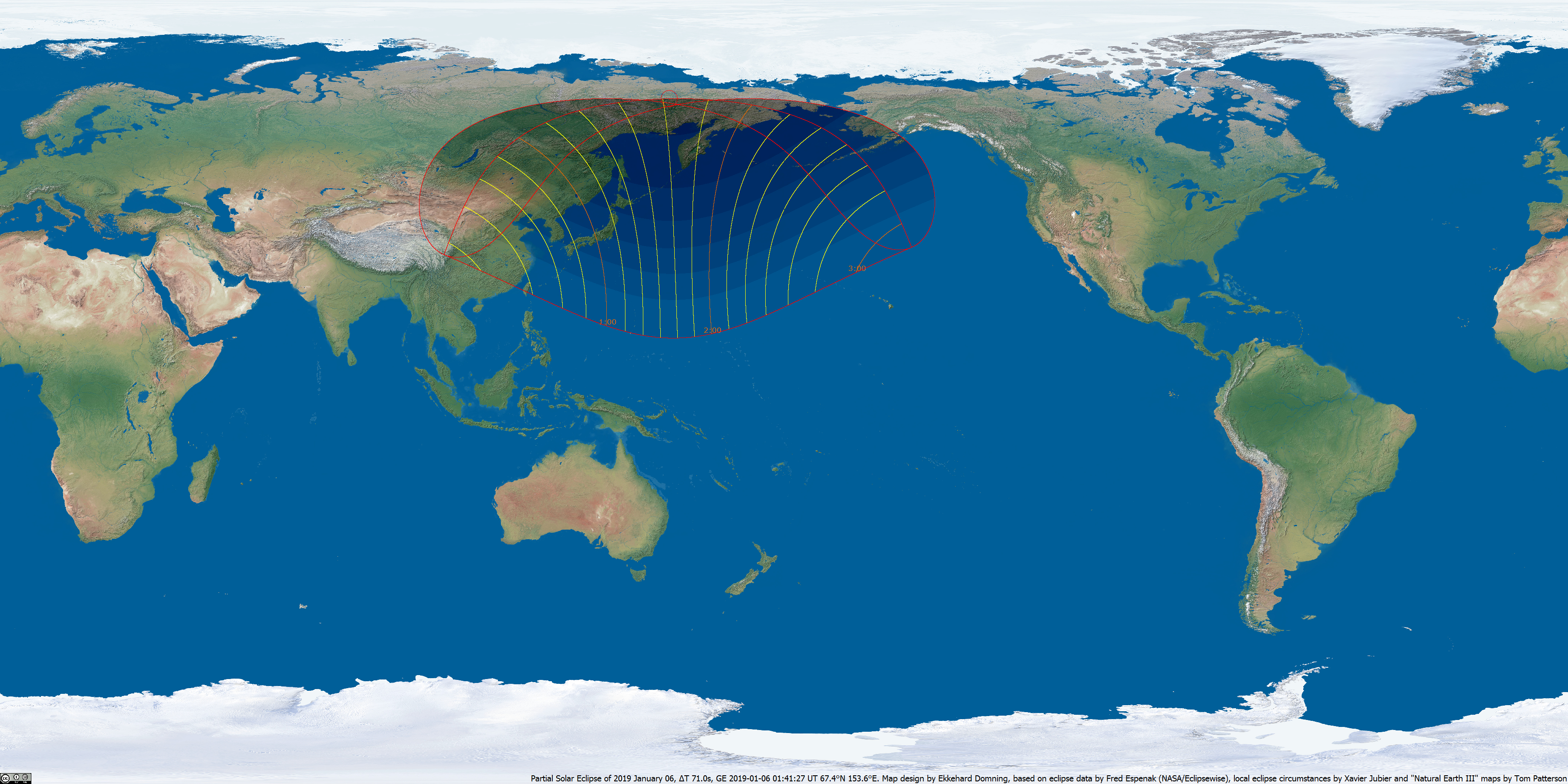 협정 세계시(UTC) 1월 5일 23시 34분경에 동아시아에서 일식이 시작되어, 4시간 후인 1월 6일 3시 49분경에 하와이 제도 북쪽의 태평양 상에서 종료되었다.[2]