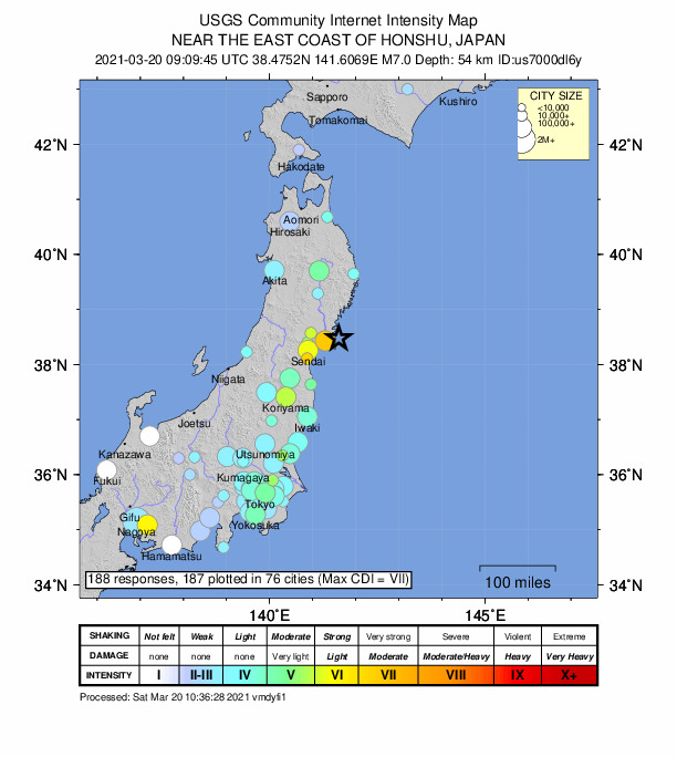 2021년 3월 20일 18시 9분, 미야기현 해역에서 규모 6.9(Mw 7.0), 진원 깊이 59km의 지진이 발생하였다.[4][1][5] 미야기현 북부에서는 장주기 지진동 계급 3을 관측했다.[6] 이 지진은 2011년 도호쿠 지방 태평양 해역 지진의 여진으로,[6][7] 미야기현 연안에 쓰나미주의보가 발령되었으나 쓰나미는 관측되지 않았다.[8] 이 지진으로 11명이 부상했다.[9][10]