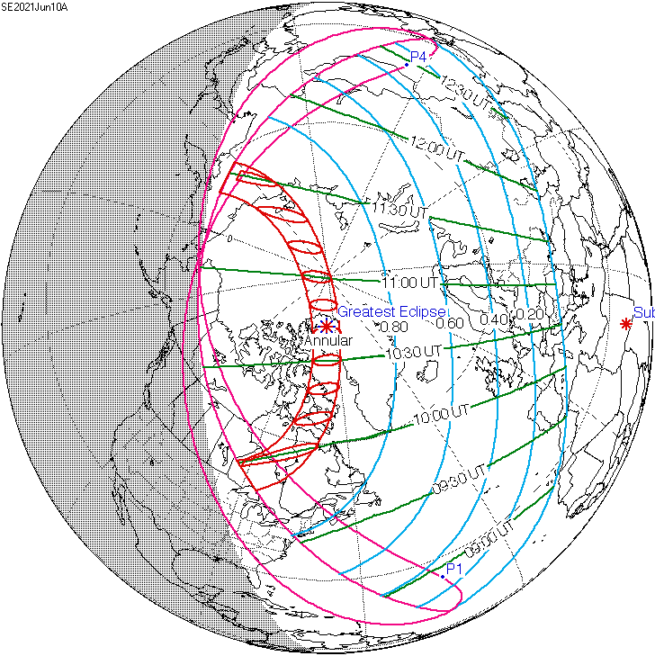 2021년 6월 10일 일식은 UTC 09시 55분에 캐나다 온타리오의 슈피리어호 북쪽 해안에서 시작되어 북극점을 지나 시베리아 북동쪽에서 UTC 11시 29분에 종료되었다.