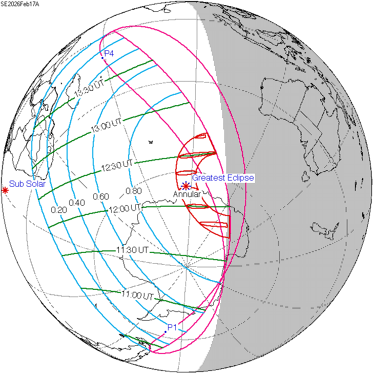 2026년 2월 17일 일식은 금환일식으로, UTC 기준 09:57:35.9부터 14:28:51.0까지 진행된다. 이 일식은 사로스 주기 121의 일부이며, 메토닉 주기, 트리토스 주기, 이넥스 주기, 반년 주기의 관련 일식과 연관된다.