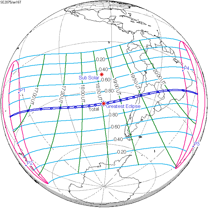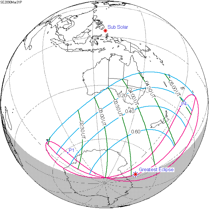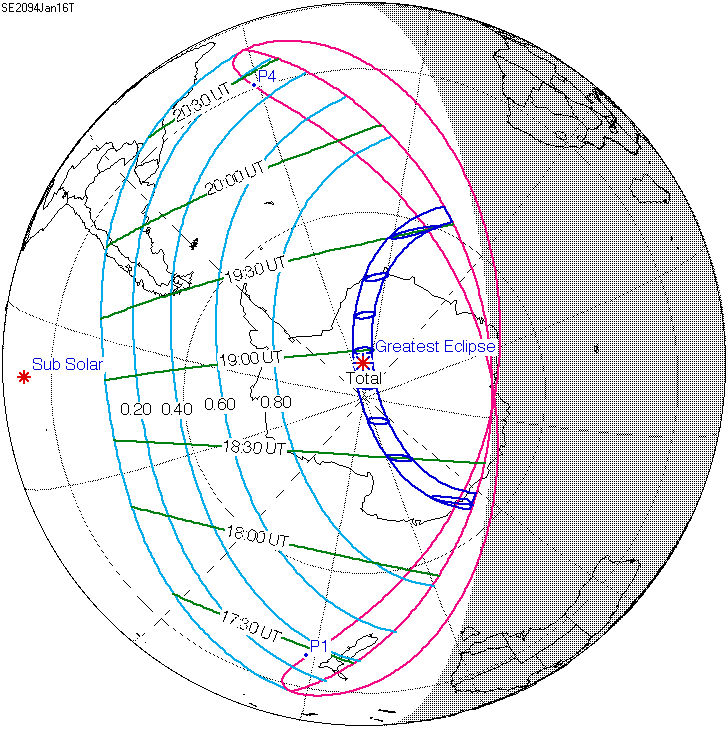 2029년 7월 11일에 발생하는 개기 일식은 남아메리카와 남극에서 관측 가능하며, 달의 그림자가 지구에 닿았다가 떠나는 시간과 여러 주기들과 관련되어 있다. - 21세기 일식 - 2024년 4월 8일 일식