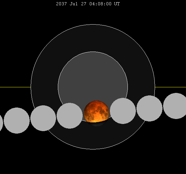 2037년 7월 13일 개기일식은 달이 지구와 태양 사이를 지나면서 태양을 완전히 가리는 현상이다.[3]