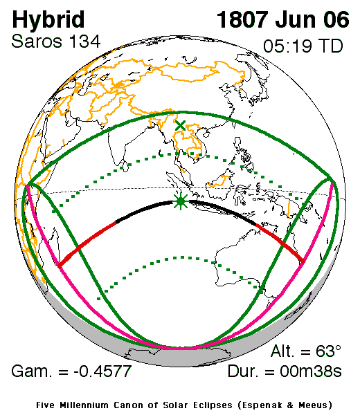 1820년 9월 7일 (사로스 122) | 1842년 7월 8일 (사로스 124) | 1875년 4월 6일 (사로스 127) | 1908년 1월 3일 (사로스 130) | 1918년 12월 3일 (사로스 131) |